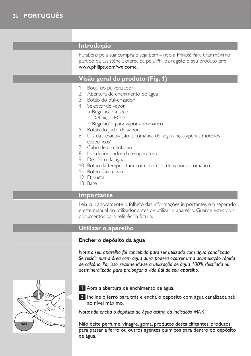 Bocal do pulverizador Abertura de enchimento de água Botão do pulverizador Selector de vapor a. Regulação a seco b. Definição ECO c. Regulação para vapor automático Botão do jacto de vapor Luz da desactivação automática de segurança (apenas modelos específicos) Cabo de alimentação Luz do indicador da temperatura Depósito da água Botão da temperatura com controlo de vapor automático Botão Calc-clean Etiqueta Base Importante Leia cuidadosamente o folheto das informações importantes em separado e este manual do utilizador antes de utilizar o aparelho. Guarde estes dois documentos para referência futura. Utilizar o aparelho Encher o depósito da água Nota: o seu aparelho foi concebido para ser utilizado com água canalizada. Se residir numa área com água dura, poderá ocorrer uma acumulação rápida de calcário. Por isso, recomenda-se a utilização de água 100% destilada ou desmineralizada para prolongar a vida útil do seu aparelho. 1 Abra a abertura de enchimento de água. 2 Incline o ferro para trás e encha o depósito com água canalizada até ao nível máximo. Nota: não encha o depósito de água acima da indicação MAX. Não deite perfume, vinagre, goma, produtos descalcificantes, produtos para passar a ferro ou outros agentes químicos para dentro do depósito de água. Português