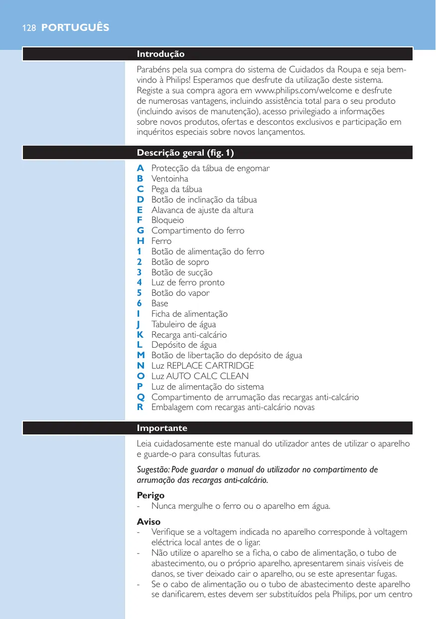 Lisez attentivement ce mode d’emploi avant d’utiliser l’appareil et conservez-le pour un usage ultérieur. Conseil :Vous pouvez loger le mode d’emploi dans le compartiment de rangement des cartouches anticalcaire. Danger -- Ne plongez jamais le fer ni l’appareil dans l’eau. Avertissement -- Avant de brancher l’appareil, vérifiez que la tension indiquée sur l’appareil correspond à la tension supportée par le secteur local. -- N’utilisez pas l’appareil si la fiche, le cordon d’alimentation, le cordon flexible ou l’appareil lui-même sont endommagés, si l’appareil est tombé ou s’il fuit.