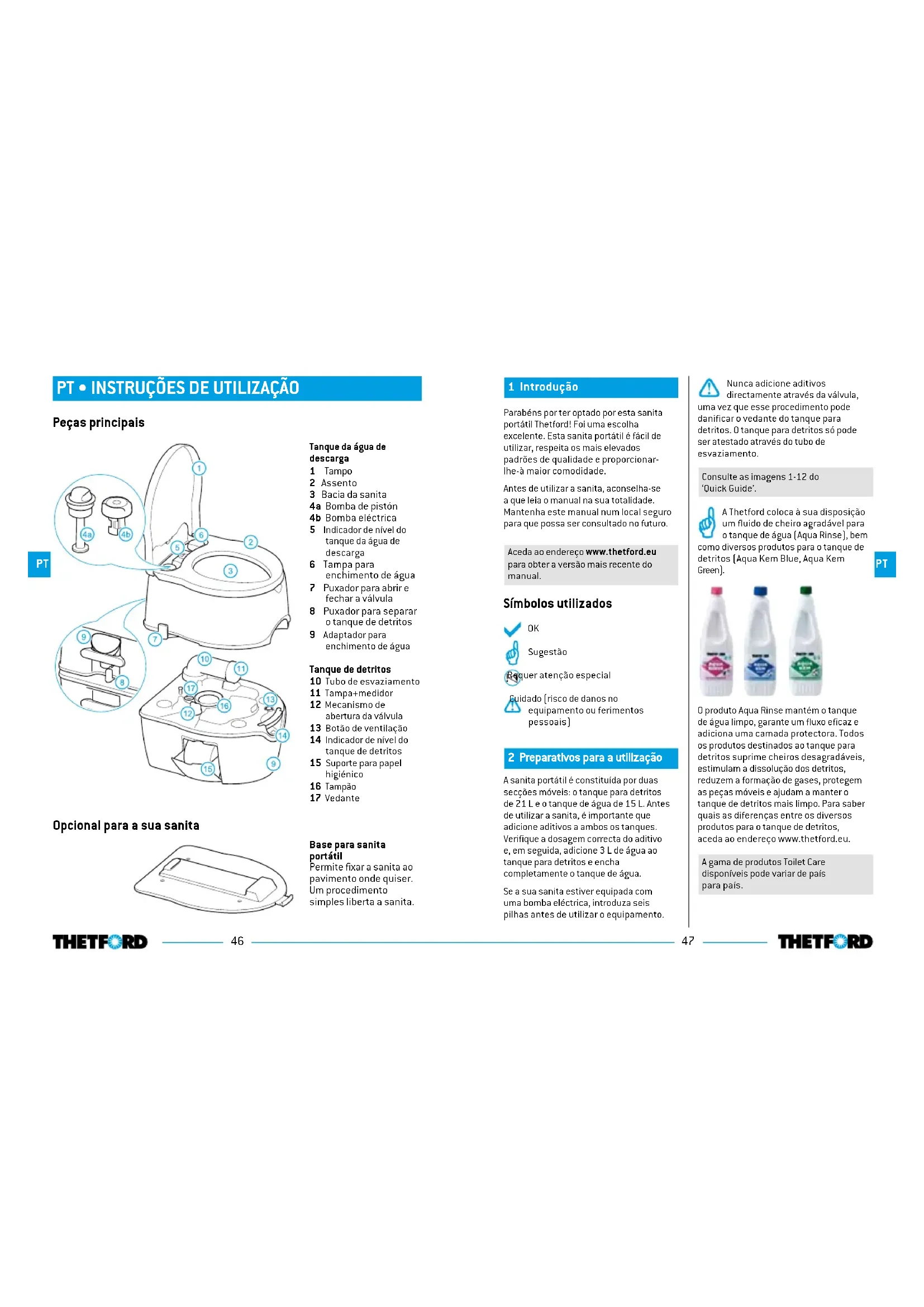Sugestão Requer atenção especial Cuidado (risco de danos no equipamento ou ferimentos pessoais) 2 Preparativos para a utilização A sanita portátil é constituída por duas secções móveis: o tanque para detritos de 21 L e o tanque de água de 15 L. Antes de utilizar a sanita, é importante que adicione aditivos a ambos os tanques. Verifique a dosagem correcta do aditivo e, em seguida, adicione 3 L de água ao tanque para detritos e encha completamente o tanque de água. Se a sua sanita estiver equipada com uma bomba eléctrica, introduza seis pilhas antes de utilizar o equipamento.Nunca adicione aditivos directamente através da válvula, uma vez que esse procedimento pode danificar o vedante do tanque para detritos. O tanque para detritos só pode ser atestado através do tubo de esvaziamento. Consulte as imagens 1-12 do ‘Quick Guide’.A Thetford coloca à sua disposição um fluido de cheiro agradável para o tanque de água (Aqua Rinse), bem como diversos produtos para o tanque de detritos (Aqua Kem Blue, Aqua Kem Green). O produto Aqua Rinse mantém o tanque de água limpo, garante um fluxo eficaz e adiciona uma camada protectora. Todos os produtos destinados ao tanque para detritos suprime cheiros desagradáveis, estimulam a dissolução dos detritos, reduzem a formação de gases, protegem as peças móveis e ajudam a manter o tanque de detritos mais limpo. Para saber quais as diferenças entre os diversos produtos para o tanque de detritos, aceda ao endereço www.thetford.eu.A gama de produtos Toilet Care disponíveis pode variar de país para país.
