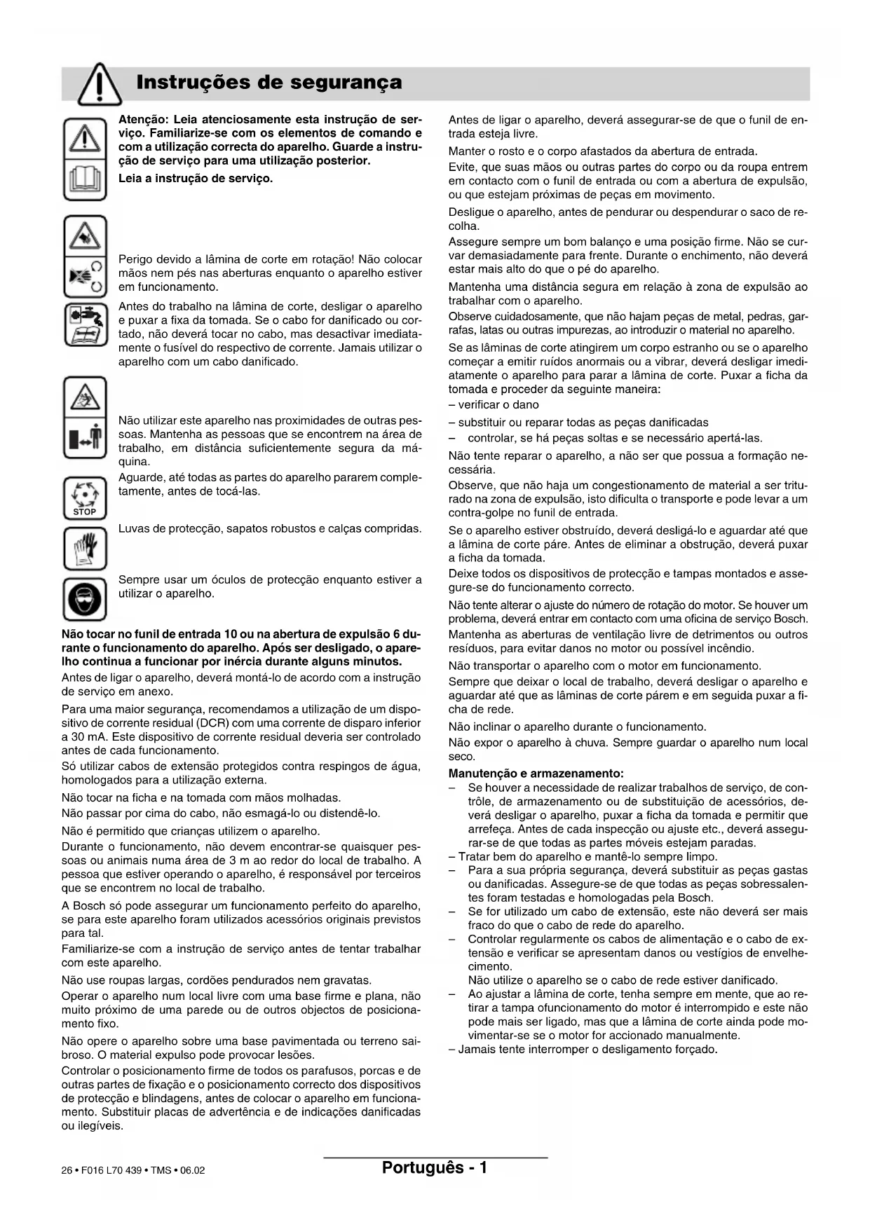 Declaración de conformidad F016 L70 439 - book.book Seite 5 Dienstag, 28. Februar 2006 7:57 07 25 • F016 L70 439 • TMS • 06.02Português - 1 Atenção: Leia atenciosamente esta instrução de ser- viço. Familiarize-se com os elementos de comando e com a utilização correcta do aparelho. Guarde a instru- ção de serviço para uma utilização posterior. Leia a instrução de serviço. Perigo devido a lâmina de corte em rotação! Não colocar mãos nem pés nas aberturas enquanto o aparelho estiver em funcionamento. Antes do trabalho na lâmina de corte, desligar o aparelho e puxar a fixa da tomada. Se o cabo for danificado ou cor- tado, não deverá tocar no cabo, mas desactivar imediata- mente o fusível do respectivo de corrente. Jamais utilizar o aparelho com um cabo danificado. Não utilizar este aparelho nas proximidades de outras pes- soas. Mantenha as pessoas que se encontrem na área de trabalho, em distância suficientemente segura da má- quina. Aguarde, até todas as partes do aparelho pararem comple- tamente, antes de tocá-las. Luvas de protecção, sapatos robustos e calças compridas. Sempre usar um óculos de protecção enquanto estiver a utilizar o aparelho. Não tocar no funil de entrada 10 ou na abertura de expulsão 6 du- rante o funcionamento do aparelho. Após ser desligado, o apare- lho continua a funcionar por inércia durante alguns minutos. Antes de ligar o aparelho, deverá montá-lo de acordo com a instrução de serviço em anexo. Para uma maior segurança, recomendamos a utilização de um dispo- sitivo de corrente residual (DCR) com uma corrente de disparo inferior a 30 mA. Este dispositivo de corrente residual deveria ser controlado antes de cada funcionamento. Só utilizar cabos de extensão protegidos contra respingos de água, homologados para a utilização externa. Não tocar na ficha e na tomada com mãos molhadas. Não passar por cima do cabo, não esmagá-lo ou distendê-lo. Não é permitido que crianças utilizem o aparelho. Durante o funcionamento, não devem encontrar-se quaisquer pes- soas ou animais numa área de 3 m ao redor do local de trabalho. A pessoa que estiver operando o aparelho, é responsável por terceiros que se encontrem no local de trabalho. A Bosch só pode assegurar um funcionamento perfeito do aparelho, se para este aparelho foram utilizados acessórios originais previstos para tal. Familiarize-se com a instrução de serviço antes de tentar trabalhar com este aparelho. Não use roupas largas, cordões pendurados nem gravatas. Operar o aparelho num local livre com uma base firme e plana, não muito próximo de uma parede ou de outros objectos de posiciona- mento fixo. Não opere o aparelho sobre uma base pavimentada ou terreno sai- broso. O material expulso pode provocar lesões. Controlar o posicionamento firme de todos os parafusos, porcas e de outras partes de fixação e o posicionamento correcto dos dispositivos de protecção e blindagens, antes de colocar o aparelho em funciona- mento. Substituir placas de advertência e de indicações danificadas ou ilegíveis. Antes de ligar o aparelho, deverá assegurar-se de que o funil de en- trada esteja livre. Manter o rosto e o corpo afastados da abertura de entrada. Evite, que suas mãos ou outras partes do corpo ou da roupa entrem em contacto com o funil de entrada ou com a abertura de expulsão, ou que estejam próximas de peças em movimento. Desligue o aparelho, antes de pendurar ou despendurar o saco de re- colha. Assegure sempre um bom balanço e uma posição firme. Não se cur- var demasiadamente para frente. Durante o enchimento, não deverá estar mais alto do que o pé do aparelho. Mantenha uma distância segura em relação à zona de expulsão ao trabalhar com o aparelho. Observe cuidadosamente, que não hajam peças de metal, pedras, gar- rafas, latas ou outras impurezas, ao introduzir o material no aparelho. Se as lâminas de corte atingirem um corpo estranho ou se o aparelho começar a emitir ruídos anormais ou a vibrar, deverá desligar imedi- atamente o aparelho para parar a lâmina de corte. Puxar a ficha da tomada e proceder da seguinte maneira: – verificar o dano – substituir ou reparar todas as peças danificadas – controlar, se há peças soltas e se necessário apertá-las. Não tente reparar o aparelho, a não ser que possua a formação ne- cessária. Observe, que não haja um congestionamento de material a ser tritu- rado na zona de expulsão, isto dificulta o transporte e pode levar a um contra-golpe no funil de entrada. Se o aparelho estiver obstruído, deverá desligá-lo e aguardar até que a lâmina de corte páre. Antes de eliminar a obstrução, deverá puxar a ficha da tomada. Deixe todos os dispositivos de protecção e tampas montados e asse- gure-se do funcionamento correcto. Não tente alterar o ajuste do número de rotação do motor. Se houver um problema, deverá entrar em contacto com uma oficina de serviço Bosch. Mantenha as aberturas de ventilação livre de detrimentos ou outros resíduos, para evitar danos no motor ou possível incêndio. Não transportar o aparelho com o motor em funcionamento. Sempre que deixar o local de trabalho, deverá desligar o aparelho e aguardar até que as lâminas de corte párem e em seguida puxar a fi- cha de rede. Não inclinar o aparelho durante o funcionamento. Não expor o aparelho à chuva. Sempre guardar o aparelho num local seco. Manutenção e armazenamento: – Se houver a necessidade de realizar trabalhos de serviço, de con- trôle, de armazenamento ou de substituição de acessórios, de- verá desligar o aparelho, puxar a ficha da tomada e permitir que arrefeça. Antes de cada inspecção ou ajuste etc., deverá assegu- rar-se de que todas as partes móveis estejam paradas. – Tratar bem do aparelho e mantê-lo sempre limpo. – Para a sua própria segurança, deverá substituir as peças gastas ou danificadas. Assegure-se de que todas as peças sobressalen- tes f