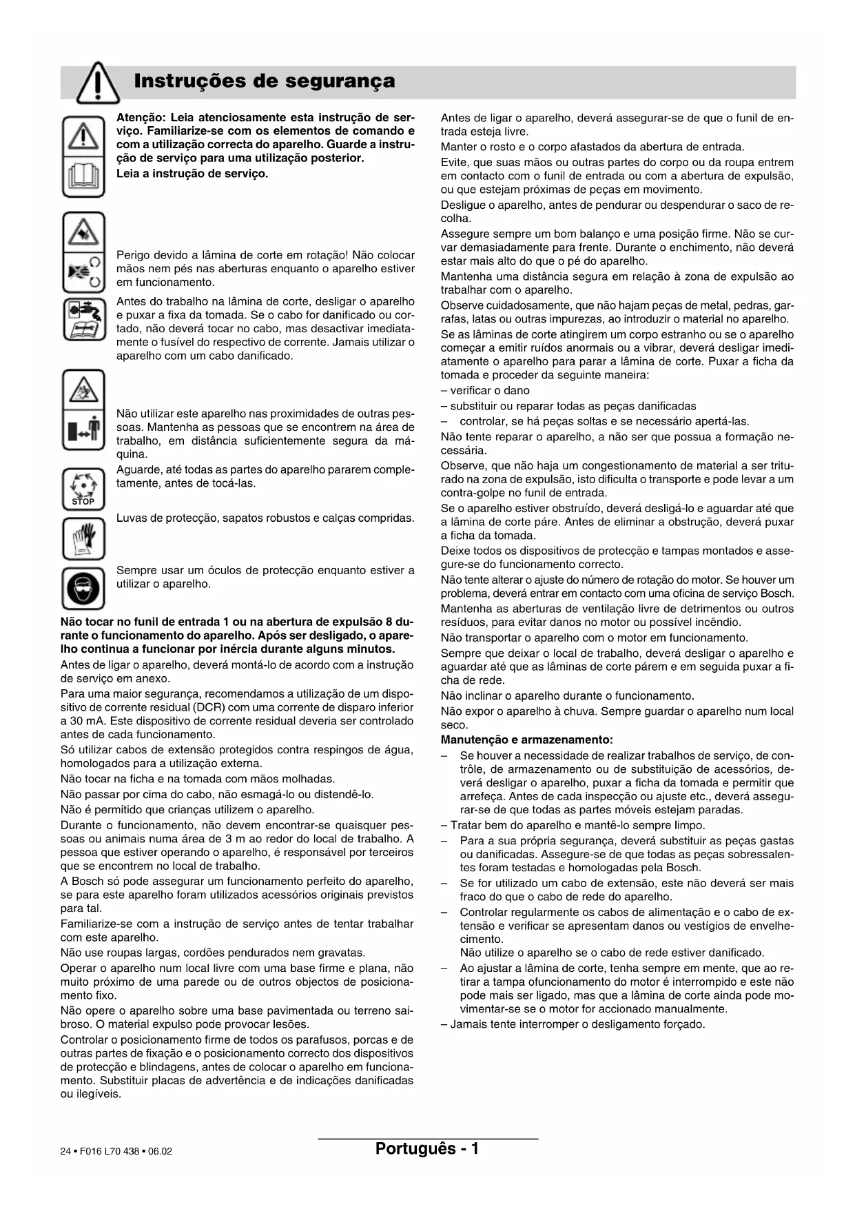 Reservado el derecho de modificaciones Servicio de asistencia técnica Declaración de conformidad F016 L70 438 - book.book Seite 5 Dienstag, 28. Februar 2006 3:26 15 23 • F016 L70 438 • 06.02Português - 1 Atenção: Leia atenciosamente esta instrução de ser- viço. Familiarize-se com os elementos de comando e com a utilização correcta do aparelho. Guarde a instru- ção de serviço para uma utilização posterior. Leia a instrução de serviço. Perigo devido a lâmina de corte em rotação! Não colocar mãos nem pés nas aberturas enquanto o aparelho estiver em funcionamento. Antes do trabalho na lâmina de corte, desligar o aparelho e puxar a fixa da tomada. Se o cabo for danificado ou cor- tado, não deverá tocar no cabo, mas desactivar imediata- mente o fusível do respectivo de corrente. Jamais utilizar o aparelho com um cabo danificado. Não utilizar este aparelho nas proximidades de outras pes- soas. Mantenha as pessoas que se encontrem na área de trabalho, em distância suficientemente segura da má- quina. Aguarde, até todas as partes do aparelho pararem comple- tamente, antes de tocá-las. Luvas de protecção, sapatos robustos e calças compridas. Sempre usar um óculos de protecção enquanto estiver a utilizar o aparelho. Não tocar no funil de entrada 1 ou na abertura de expulsão 8 du- rante o funcionamento do aparelho. Após ser desligado, o apare- lho continua a funcionar por inércia durante alguns minutos. Antes de ligar o aparelho, deverá montá-lo de acordo com a instrução de serviço em anexo. Para uma maior segurança, recomendamos a utilização de um dispo- sitivo de corrente residual (DCR) com uma corrente de disparo inferior a 30 mA. Este dispositivo de corrente residual deveria ser controlado antes de cada funcionamento. Só utilizar cabos de extensão protegidos contra respingos de água, homologados para a utilização externa. Não tocar na ficha e na tomada com mãos molhadas. Não passar por cima do cabo, não esmagá-lo ou distendê-lo. Não é permitido que crianças utilizem o aparelho. Durante o funcionamento, não devem encontrar-se quaisquer pes- soas ou animais numa área de 3 m ao redor do local de trabalho. A pessoa que estiver operando o aparelho, é responsável por terceiros que se encontrem no local de trabalho. A Bosch só pode assegurar um funcionamento perfeito do aparelho, se para este aparelho foram utilizados acessórios originais previstos para tal. Familiarize-se com a instrução de serviço antes de tentar trabalhar com este aparelho. Não use roupas largas, cordões pendurados nem gravatas. Operar o aparelho num local livre com uma base firme e plana, não muito próximo de uma parede ou de outros objectos de posiciona- mento fixo. Não opere o aparelho sobre uma base pavimentada ou terreno sai- broso. O material expulso pode provocar lesões. Controlar o posicionamento firme de todos os parafusos, porcas e de outras partes de fixação e o posicionamento correcto dos dispositivos de protecção e blindagens, antes de colocar o aparelho em funciona- mento. Substituir placas de advertência e de indicações danificadas ou ilegíveis. Antes de ligar o aparelho, deverá assegurar-se de que o funil de en- trada esteja livre. Manter o rosto e o corpo afastados da abertura de entrada. Evite, que suas mãos ou outras partes do corpo ou da roupa entrem em contacto com o funil de entrada ou com a abertura de expulsão, ou que estejam próximas de peças em movimento. Desligue o aparelho, antes de pendurar ou despendurar o saco de re- colha. Assegure sempre um bom balanço e uma posição firme. Não se cur- var demasiadamente para frente. Durante o enchimento, não deverá estar mais alto do que o pé do aparelho. Mantenha uma distância segura em relação à zona de expulsão ao trabalhar com o aparelho. Observe cuidadosamente, que não hajam peças de metal, pedras, gar- rafas, latas ou outras impurezas, ao introduzir o material no aparelho. Se as lâminas de corte atingirem um corpo estranho ou se o aparelho começar a emitir ruídos anormais ou a vibrar, deverá desligar imedi- atamente o aparelho para parar a lâmina de corte. Puxar a ficha da tomada e proceder da seguinte maneira: – verificar o dano – substituir ou reparar todas as peças danificadas – controlar, se há peças soltas e se necessário apertá-las. Não tente reparar o aparelho, a não ser que possua a formação ne- cessária. Observe, que não haja um congestionamento de material a ser tritu- rado na zona de expulsão, isto dificulta o transporte e pode levar a um contra-golpe no funil de entrada. Se o aparelho estiver obstruído, deverá desligá-lo e aguardar até que a lâmina de corte páre. Antes de eliminar a obstrução, deverá puxar a ficha da tomada. Deixe todos os dispositivos de protecção e tampas montados e asse- gure-se do funcionamento correcto. Não tente alterar o ajuste do número de rotação do motor. Se houver um problema, deverá entrar em contacto com uma oficina de serviço Bosch. Mantenha as aberturas de ventilação livre de detrimentos ou outros resíduos, para evitar danos no motor ou possível incêndio. Não transportar o aparelho com o motor em funcionamento. Sempre que deixar o local de trabalho, deverá desligar o aparelho e aguardar até que as lâminas de corte párem e em seguida puxar a fi- cha de rede. Não inclinar o aparelho durante o funcionamento. Não expor o aparelho à chuva. Sempre guardar o aparelho num local seco. Manutenção e armazenamento: – Se houver a necessidade de realizar trabalhos de serviço, de con- trôle, de armazenamento ou de substituição de acessórios, de- verá desligar o aparelho, puxar a ficha da tomada e permitir que arrefeça. Antes de cada inspecção ou ajuste etc., deverá assegu- rar-se de que todas as partes móveis estejam paradas. – Tratar bem do aparelho e mantê-lo sempre limpo. – Para a sua própria segurança, deverá substituir as peças gastas ou dani