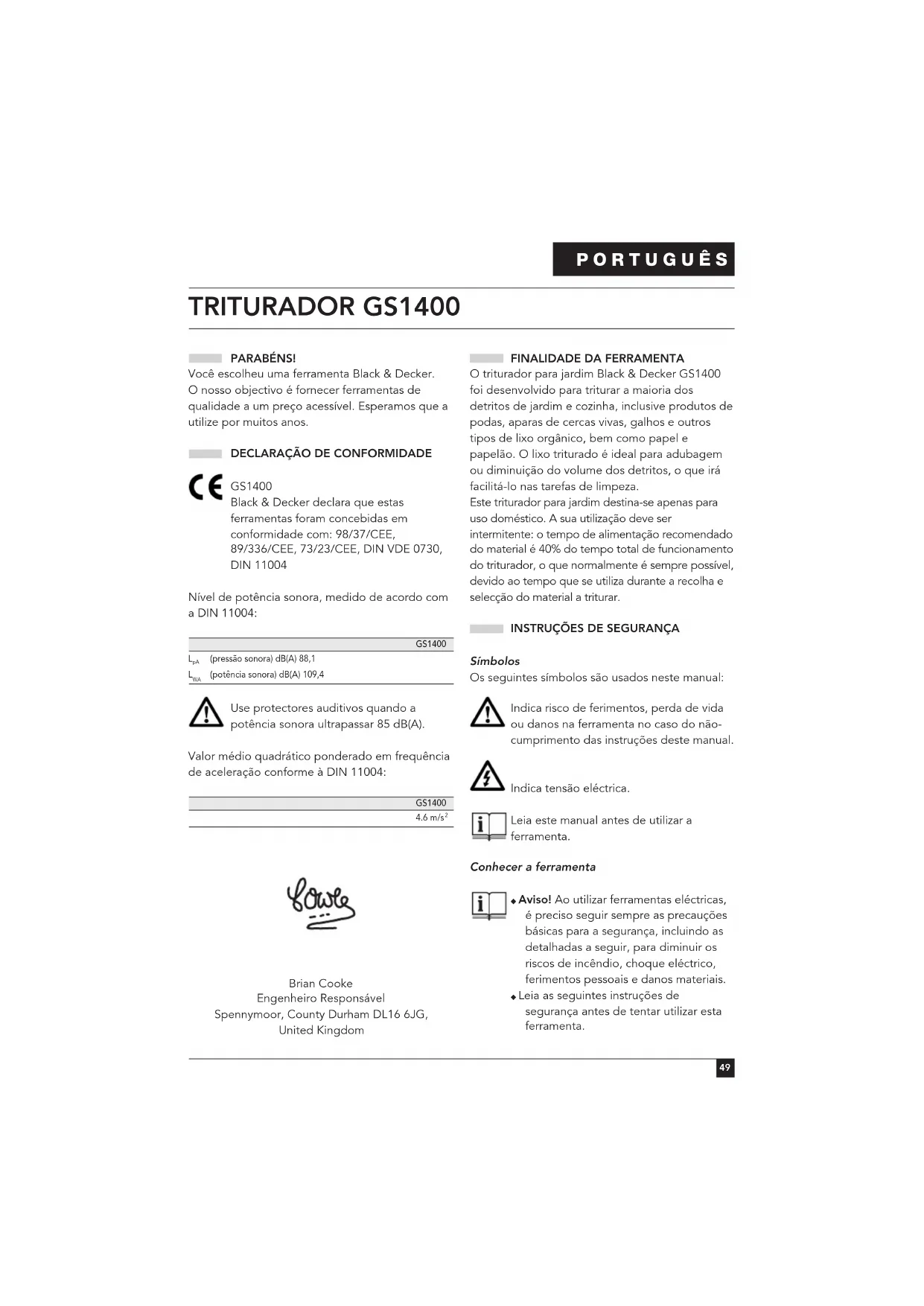 Black & Decker declare que estas ferramentas foram concebidas em conformidade com: 98/37/CEE, 89/336/CEE, 73/23/CEE, DIN VDE 0730, DIN 11004