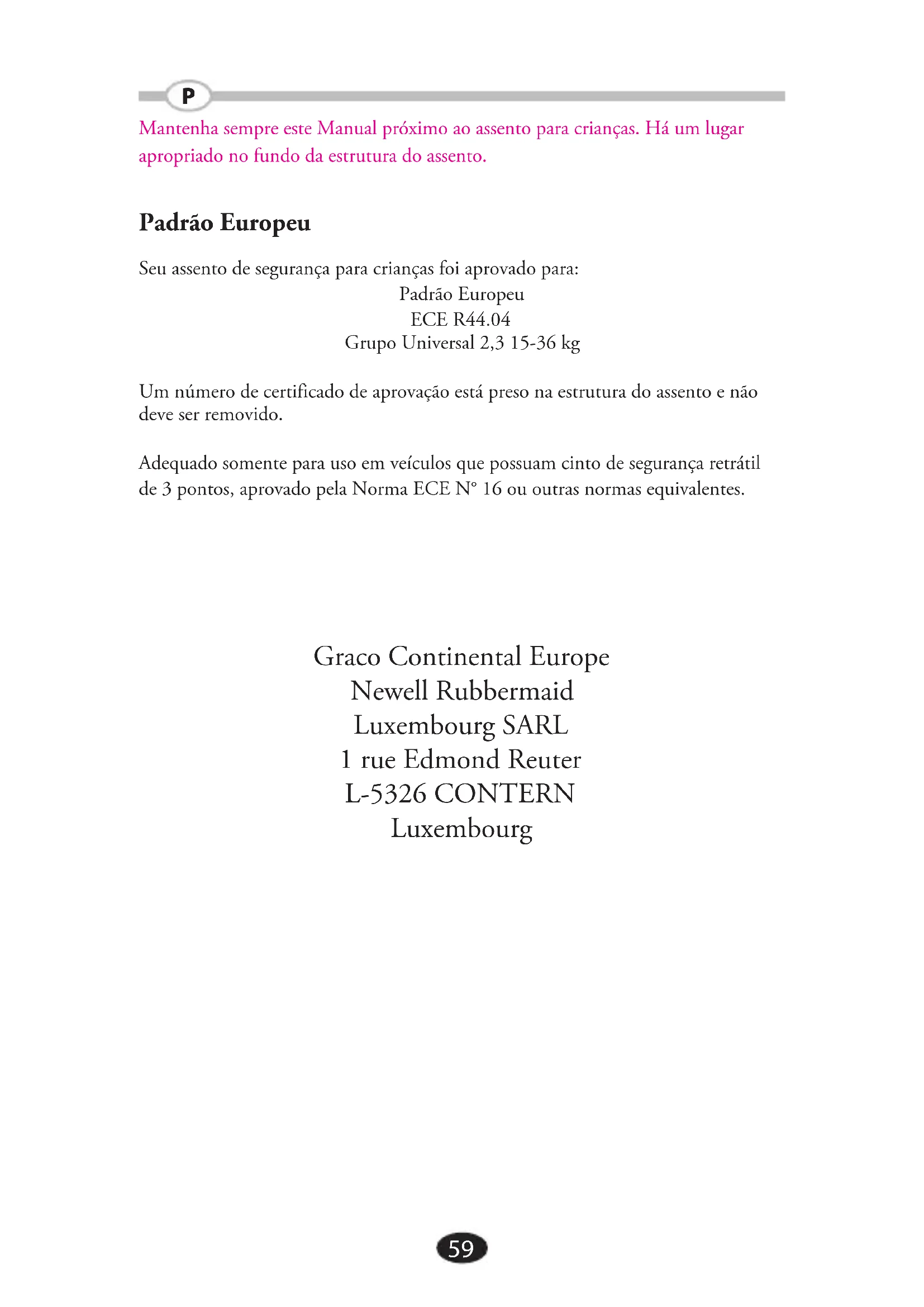 Mantenha sempre este Manual próximo ao assento para crianças. Há um lugar apropriado no fundo da estrutura do assento. Padrão Europeu Seu assento de segurança para crianças foi aprovado para: Padrão Europeu ECE R44.04 Grupo Universal 2,3 15-36 kg Um número de certificado de aprovação está preso na estrutura do assento e não deve ser removido. Adequado somente para uso em veículos que possuam cinto de segurança retrátil de 3 pontos, aprovado pela Norma ECE N° 16 ou outras normas equivalentes. Graco Continental Europe Newell Rubbermaid Luxembourg SARL 1 rue Edmond Reuter L-5326 CONTERN Luxembourg P60 AvISO NÃO INSTALE OU USE ESTE ASSENTO PARA CRIANÇAS ANTES DE LER E ENTENDER AS INSTRUÇÕES DESTE MANUAL E DO MANUAL DO PROPRIETÁRIO DE SEU VEÍCULO. É muito importante que o meio auxiliar posicionador de cinto seja corretamente encaminhado com a parte do colo do cinto através das guias vermelhas do cinto sob os apoios de braço e o cinto diagonal através das guias vermelhas do cinto de ombro quando usado com um suporte para as costas ou através do clipe de posicionamento do cinto de ombro vermelho quando usado como meio auxiliar sem costas. Assegure-se que o tecido do cinto não esteja torcido. Tenha o cuidado de posicionar o instalar o meio auxiliador de forma que não possa ficar aprisionado por um assento móvel nem na porta do veículo. NÃO use capas de assento de outros fabricantes com este meio auxiliador. Consulte a loja onde comprou o produto para obter peças de reposição. NÃO uSE em nenhuma configuração que não tenha sido mostrada nas instruções. O uSO NÃO APROPRIAdO dESTE ASSENTO PARA CRIANÇAS AuMENTA O RISCO dE fERIMENTOS GRAvES Ou MORTE EM CASO dE MANOBRA BRuSCA, fREAdA REPENTINA Ou COLISÃO. Seu filho pode sofrer ferimentos em um veículo mesmo sem a ocorrência de um acidente. Freadas repentinas e manobras bruscas podem ferir seu filho se o assento para crianças não estiver instalado de modo adequado ou se o seu filho não estiver preso de maneira apropriada no assento para crianças.