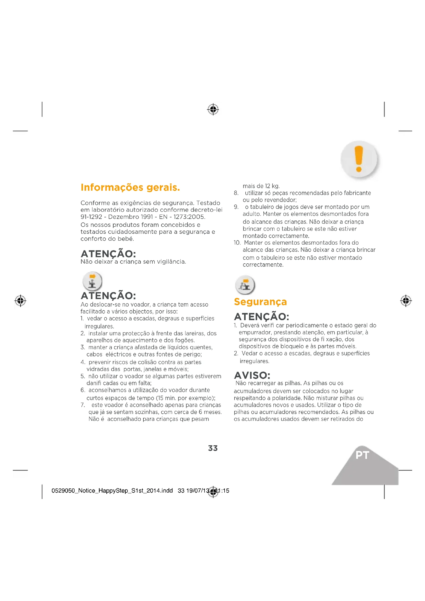 Informações gerais. Conforme as exigências de segurança. Testado em laboratório autorizado conforme decreto-lei 91-1292 - Dezembro 1991 - EN - 1273:2005. Os nossos produtos foram concebidos e testados cuidadosamente para a segurança e conforto do bebé. ATENÇÃO: Não deixar a criança sem vigilância. ATENÇÃO: Ao deslocar-se no voador, a criança tem acesso facilitado a vários objectos, por isso: