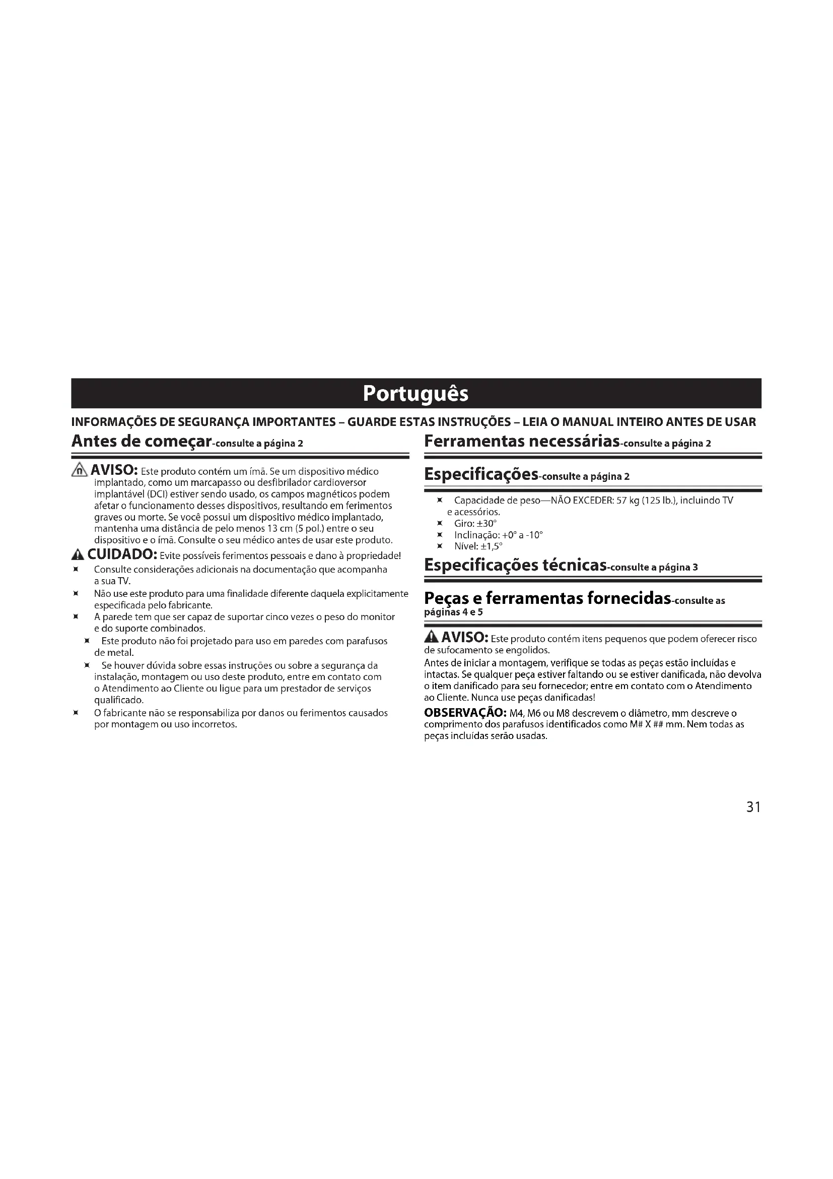 Luego de completar la instalación: A. Quite el dispositivo de bloqueo [17] de la posición de bloqueo. B. Coloque el dispositivo de bloqueo [17] en las ranuras de uno de las guías para almacenaje. Opcional - Extracción del televisor Ver página 2031 Português INFORMAÇÕES DE SEGURANÇA IMPORTANTES – GUARDE ESTAS INSTRUÇÕES – LEIA O MANUAL INTEIRO ANTES DE USAR Antes de começar-consulte a página 2 AVISO: Este produto contém um ímã. Se um dispositivo médico implantado, como um marcapasso ou desfibrilador cardioversor implantável (DCI) estiver sendo usado, os campos magnéticos podem afetar o funcionamento desses dispositivos, resultando em ferimentos graves ou morte. Se você possui um dispositivo médico implantado, mantenha uma distância de pelo menos 13 cm (5 pol.) entre o seu dispositivo e o ímã. Consulte o seu médico antes de usar este produto. CUIDADO: Evite possíveis ferimentos pessoais e dano à propriedade! Consulte considerações adicionais na documentação que acompanha a sua TV. Não use este produto para uma finalidade diferente daquela explicitamente especificada pelo fabricante. A parede tem que ser capaz de suportar cinco vezes o peso do monitor e do suporte combinados. Este produto não foi projetado para uso em paredes com parafusos de metal. Se houver dúvida sobre essas instruções ou sobre a segurança da instalação, montagem ou uso deste produto, entre em contato com o Atendimento ao Cliente ou ligue para um prestador de serviços qualificado. O fabricante não se responsabiliza por danos ou ferimentos causados por montagem ou uso incorretos. Ferramentas necessárias-consulte a página 2 Especificações-consulte a página 2 Capacidade de peso—NÃO EXCEDER: 57 kg (125 lb.), incluindo TV e acessórios. Giro: ±30° Inclinação: +0° a -10° Nível: ±1,5° Especificações técnicas-consulte a página 3 Peças e ferramentas fornecidas-consulte as páginas 4 e 5 AVISO: Este produto contém itens pequenos que podem oferecer risco de sufocamento se engolidos. Antes de iniciar a montagem, verifique se todas as peças estão incluídas e intactas. Se qualquer peça estiver faltando ou se estiver danificada, não devolva o item danificado para seu fornecedor; entre em contato com o Atendimento ao Cliente. Nunca use peças danificadas! OBSERVAÇÃO: M4, M6 ou M8 descrevem o diâmetro, mm descreve o comprimento dos parafusos identificados como M# X ## mm. Nem todas as peças incluídas serão usadas.32 1 Selecione o material da TV-consulte a página 6 Rosqueie manualmente os parafusos nas inserções rosqueadas, na parte traseira da TV, para determinar o diâmetro correto do parafuso (M4, M6, ou M8). Tente usar apenas um parafuso primeiro. Se você precisar de mais espaço, tente usar um parafuso com um espaçador. CUIDADO: Evite possíveis ferimentos pessoais e dano à propriedade! Sua TV pode ser danificada se você usar hardware longo demais. Se você encontrar resistência, pare imediatamente e contate o serviço ao cliente. 1-1 Prenda os suportes na TV-consulte a página 7 Usando o hardware selecionado na etapa 1, prenda os suportes na sua TV. A. Use a opção A se a sua TV possui uma parte traseira plana/desobstruída. B. Use a opção B se a sua TV possui uma parte traseira irregular, com orifícios de montagem com recuo ou se você precisa de mais espaço para acomodar cabos, recuos ou saliências. Confirme que os suportes estão nivelados na parte de trás da TV. 2 Monte a placa de parede-consulte a página 8 2-1 Prepare a placa de parede para a montagem- consulte a página 8 Deslize os braços da placa de parede [01] juntos e encaixe a trava deslizante [17] na posição. Isso travará os braços em toda a extensão, facilitando a montagem da placa de parede e a conexão da TV. 2-2 (Montagem com pino de madeira) Encontre os pinos-consulte a página 9 Para obter assistência na determinação do local da placa da parede, consulte sanus.com. CUIDADO: Evite possíveis ferimentos pessoais e dano à propriedade! Qualquer material que cubra a parede não deve exceder 16 mm (5/8 pol.). Tamanho mínimo do pino de madeira: comum 51x102mm (2 x 4 pol.) nominal 38 x 89 mm (1/2 x 3/2 pol.)
