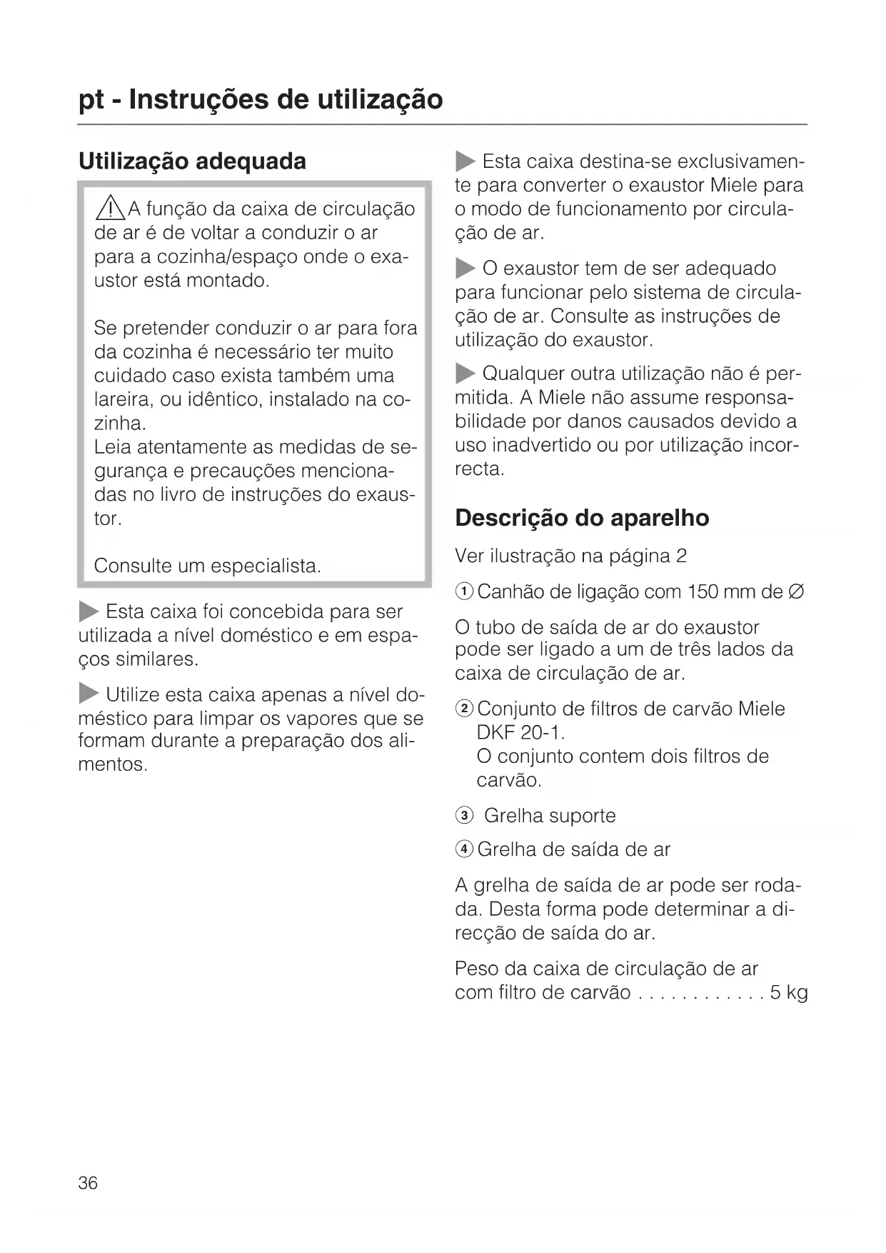 Qualquer outra utilização não é per- mitida. A Miele não assume responsa- bilidade por danos causados devido a uso inadvertido ou por utilização incor- recta. Descrição do aparelho Ver ilustração na página 2 a Canhão de ligação com 150 mm de C O tubo de saída de ar do exaustor pode ser ligado a um de três lados da caixa de circulação de ar. b Conjunto de filtros de carvão Miele DKF 20-1. O conjunto contem dois filtros de carvão. c Grelha suporte d Grelha de saída de ar A grelha de saída de ar pode ser roda- da. Desta forma pode determinar a di- recção de saída do ar. Peso da caixa de circulação de ar com filtro de carvão ............5kg pt - Instruções de utilização 36Descrição de funcionamento O ar aspirado passa pelo filtro de gor- duras do exaustor, é limpo e depois conduzido para a caixa de circulação de ar. Ai o ar é limpo adicionalmente por dois filtros de carvão e volta a ser conduzido para a cozinha. Certifique-se de que os filtros de car- vão estão montados. A caixa de circulação de ar é montada num espaço da cozinha à sua escolha. O tubo de circulação de ar do exaustor é ligado à caixa de circulação de ar. A tampa anti retorno e o filtro de carvão não são montados no exaustor. Ao montar o exaustor consulte as res- pectivas instruções de montagem. Local da instalação – A caixa deverá ficar montada a uma distância mínima de três metros do exaustor. – Escolha a localização e a orientação da saída de ar, de forma que o ar possa fluir livremente para fora da caixa. O fluxo de ar não deve ficar direccionado para o tecto ou para uma parede. – O fluxo de ar não deve ser direccio- nado para o exaustor. A montagem da caixa está descrita a partir da página 48. Tubo de circulação de ar entre o exa- ustor e a box. – Para ligar o exaustor à caixa utilize somente um tubo de circulação de ar liso ou flexível e de material não inflamável. Para atingir o fluxo de ar máximo e o mínimo de ruído, tome nota do seguin- te: – O diâmetro do tubo não deve ser in- ferior a 150 mm. – Caso sejam utilizados tubos de saída de ar planos, a secção transversal não deve ser menor que a secção transversal do canhão de saída de ar. – O tubo de saída de ar deve ser, o mais curto possível e montado em li- nha recta. – Utilize somente curvas com rum raio grande. – O tubo de saída de ar não pode ser dobrado ou comprimido. – Verifique se todas as ligação estão correctas e se não existem fugas. – Se o tubo for montado em posição horizontal deverá ter uma inclinação de pelo menos 1 cm por metro. Assim será impedido que a eventual formação de água condensada pos- sa escorrer para o interior do exaus- tor. pt - Instruções de utilização 37Filtro de carvão Ao colocar pela primeira vez: ^ Se o exaustor tiver um contador de horas de funcionamento para o filtro de carvão , deverá ser activado. Consulte as instruções de utilização do exaustor. Substituição do filtro de carvão Substitua os filtros de carvão sempre que – o símbolo do filtro de carvão da tecla de horas de funcionamento acenda (em exaustores que estejam equipados de acordo),