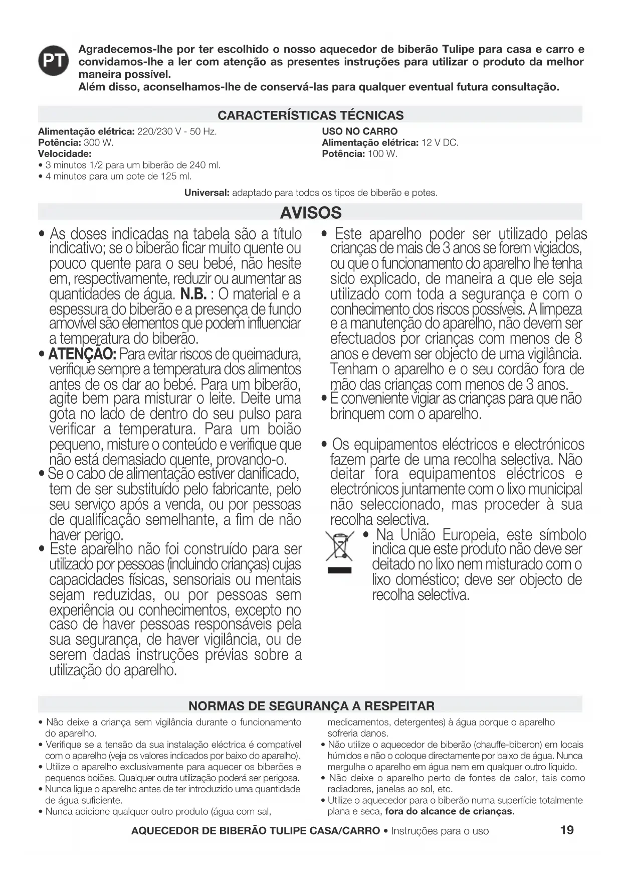 Agradecemos-lhe por ter escolhido o nosso aquecedor de biberão Tulipe para casa e carro e convidamos-lhe a ler com atenção as presentes instruções para utilizar o produto da melhor maneira possível. Além disso, aconselhamos-lhe de conservá-las para qualquer eventual futura consultação. AVISOS
