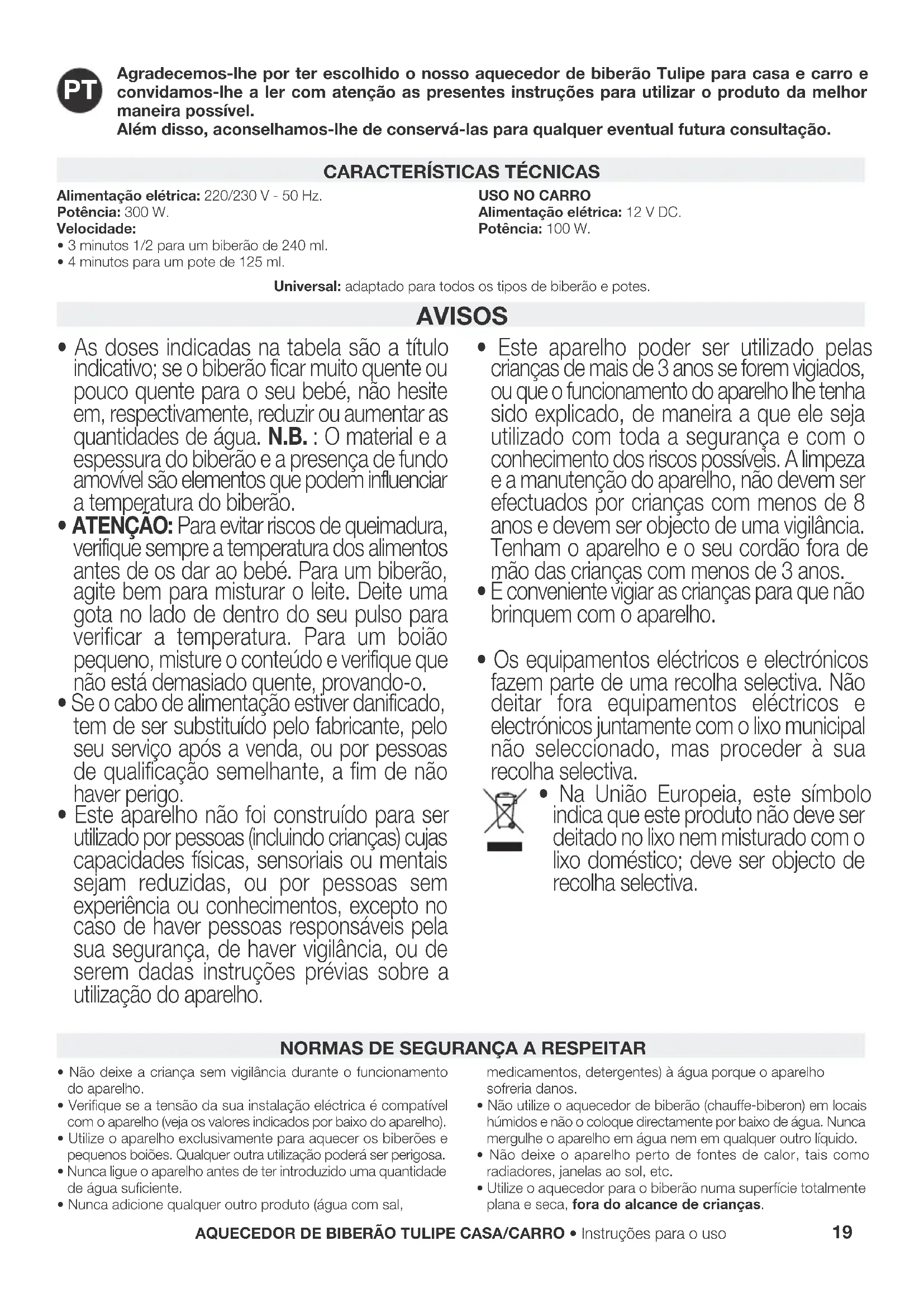 Agradecemos-lhe por ter escolhido o nosso aquecedor de biberão Tulipe para casa e carro e convidamos-lhe a ler com atenção as presentes instruções para utilizar o produto da melhor maneira possível. Além disso, aconselhamos-lhe de conservá-las para qualquer eventual futura consultação. AVISOS