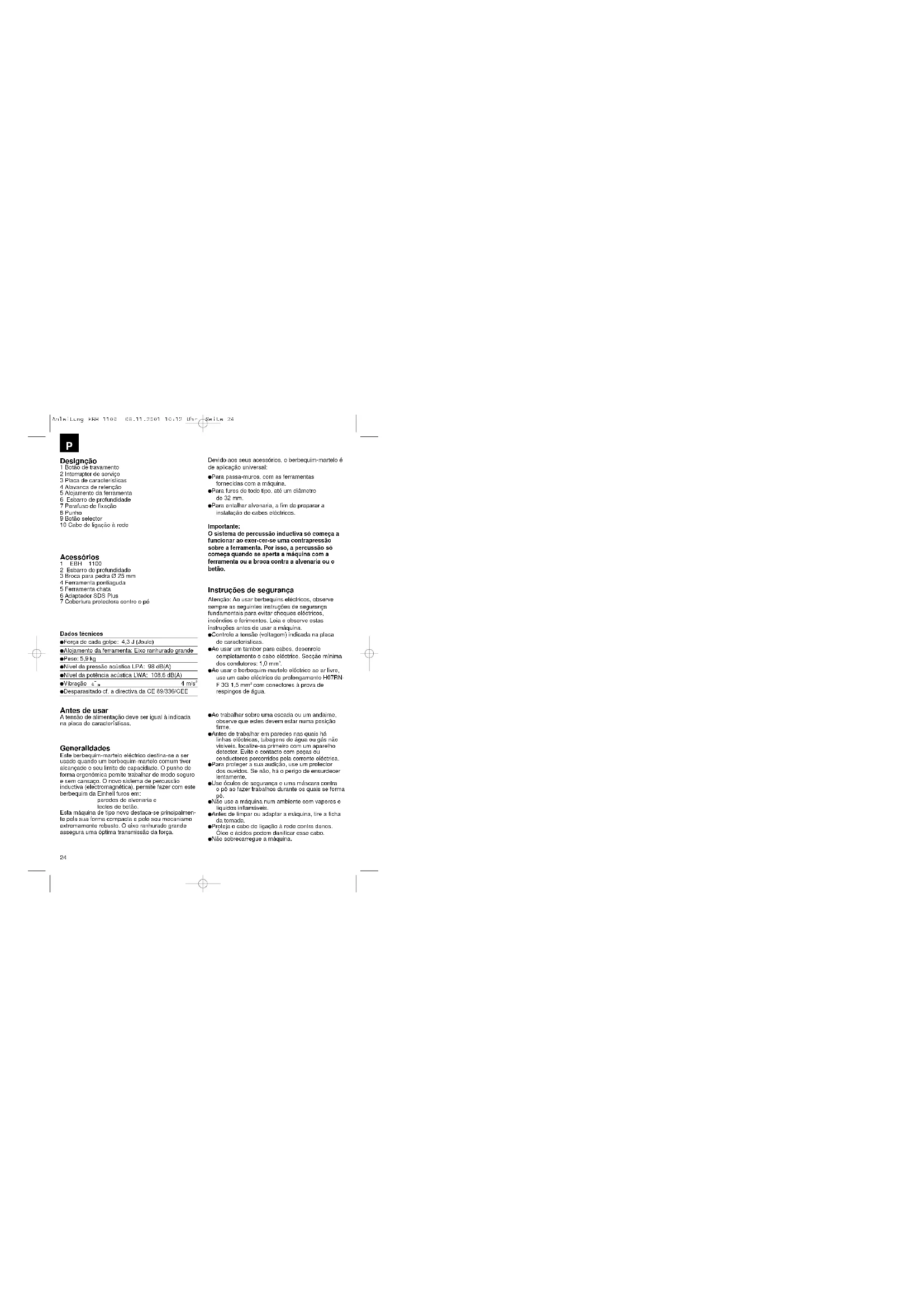 Desparasitado cf. a directiva da CE 89/336/CEE Antes de usar A tensão de alimentação deve ser igual à indicada na placa de características. Generalidades Este berbequim-martelo eléctrico destina-se a ser usado quando um berbequim-martelo comum tiver alcançado o seu limite de capacidade. O punho de forma ergonómica pemite trabalhar de modo seguro e sem cansaço. O novo sistema de percussão inductiva (electromagnética), permite fazer com este berbequim da Einhell furos em: paredes de alvenaria e tectos de betão. Esta máquina de tipo novo destaca-se principalmen- te pela sua forma compacta e pelo seu mecanismo extremamente robusto. O eixo ranhurado grande assegura uma óptima transmissão da força. Devido aos seus acessórios, o berbequim-martelo é de aplicação universal: Para passa-muros, com as ferramentas fornecidas com a máquina. Para furos de todo tipo, até um diâmetro de 32 mm. Para entalhar alvenaria, a fim de preparar a instalação de cabos eléctricos. Importante: O sistema de percussão inductiva só começa a funcionar ao exer-cer-se uma contrapressão sobre a ferramenta. Por isso, a percussão só começa quando se aperta a máquina com a ferramenta ou a broca contra a alvenaria ou o betão. Instruções de segurança Atenção: Ao usar berbequins eléctricos, observe sempre as seguintes instruções de segurança fundamentais para evitar choques eléctricos, incêndios e ferimentos. Leia e observe estas instruções antes de usar a máquina. Controle a tensão (voltagem) indicada na placa de características. Ao usar um tambor para cabos, desenrole completamente o cabo eléctrico. Secção mínima dos condutores: 1,0 mm