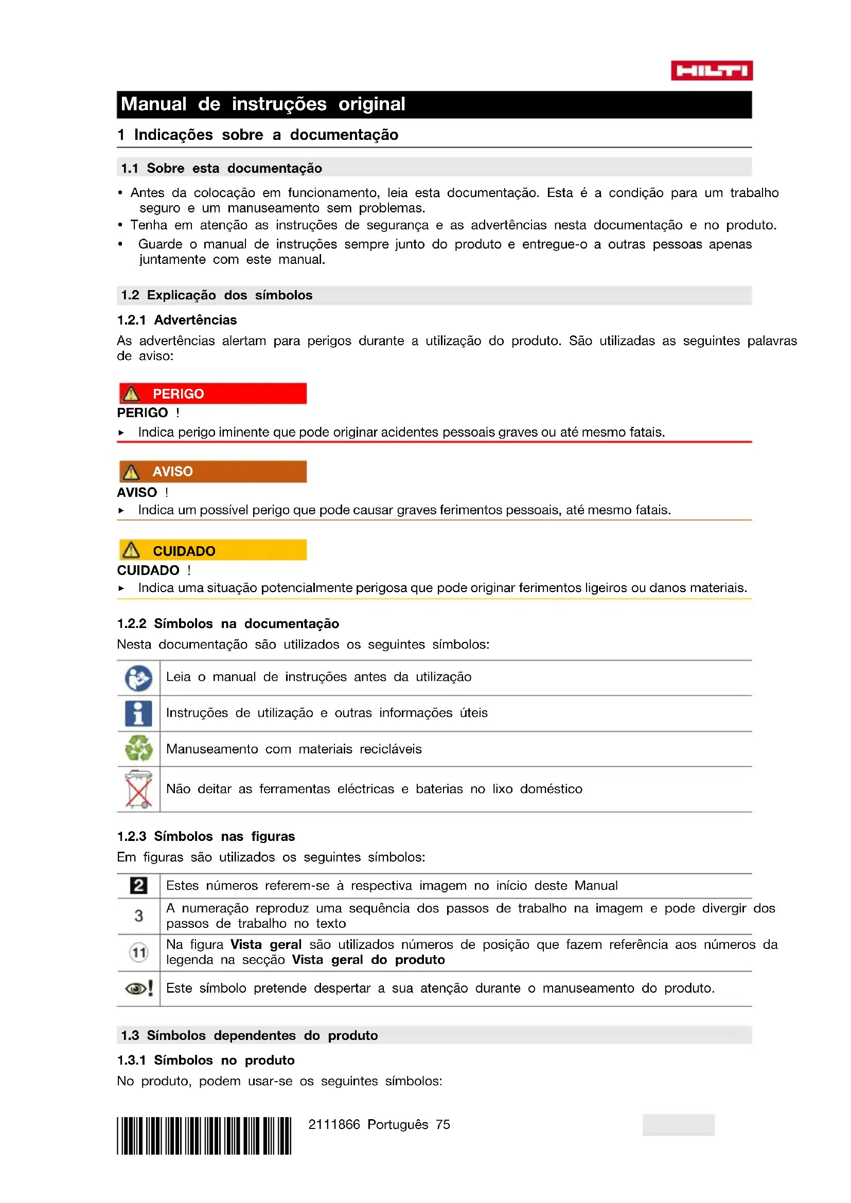 - Em caso de danos e/ou perturbações de funcionamento, não operar o produto. Mandar reparar de imediato pelo Centro de Assistência Técnica Hilti.