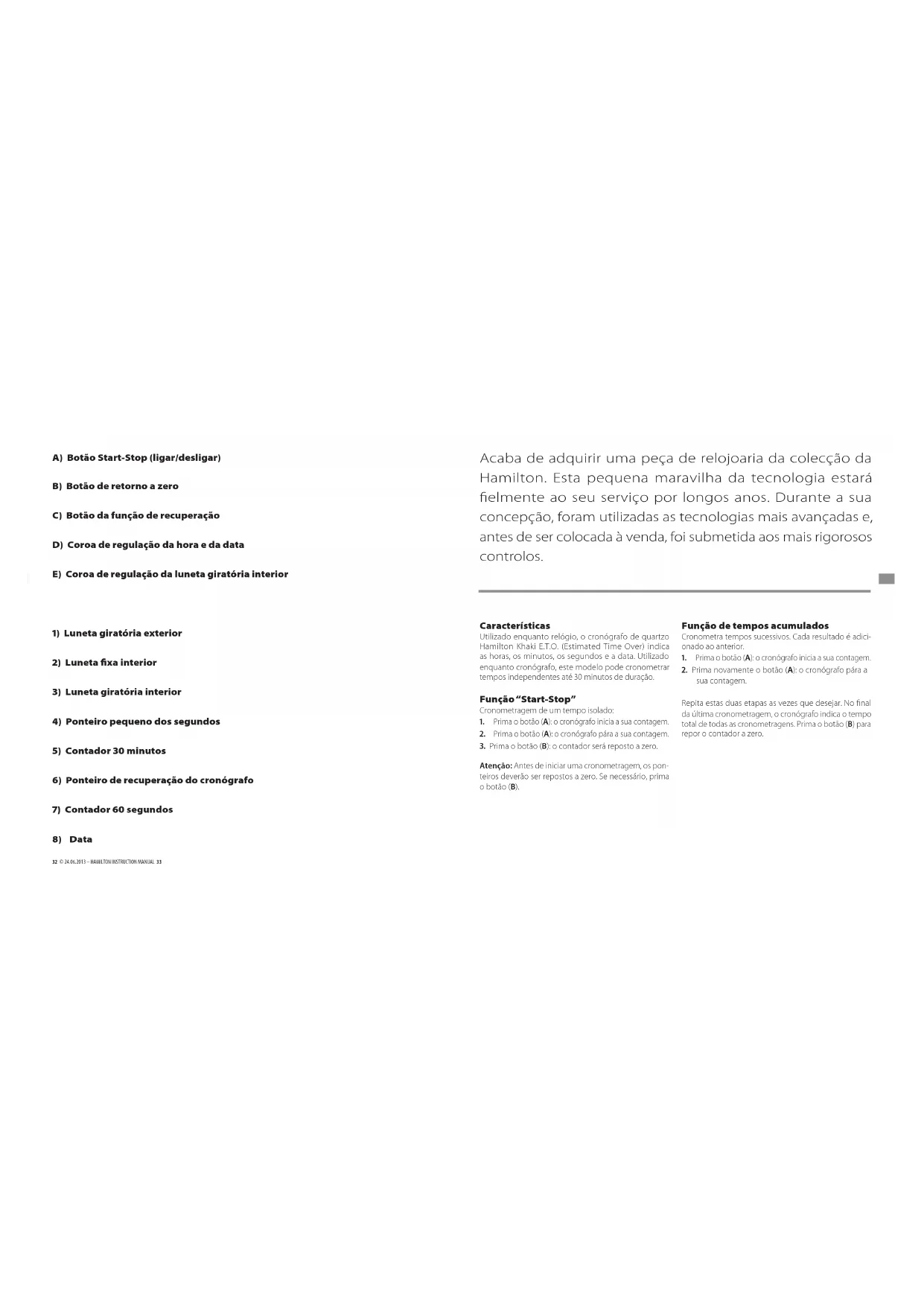 dade, frente à seta vermelha = 17,5 km/h. Regulação do fuso horário e da data Com a coroa (D) na sua posição intermédia (1), pode adiantar ou atrasar o ponteiro das horas sem afectar a regulação dos ponteiros dos minutos e dos segundos. A data é corrigida cada vez que o ponteiro das horas passa pela meia-noite. Nota: As coroas (D) e (E) são aparafusadas a m de asse- gurar uma estanquecidade máxima. Para aceder às suas funções, têm de ser desaparafusadas. Depois de utilizá-las, certique-se de que as aparafusa correctamente. Para acertar o relógio Quando a coroa (D) se encontra na posição (2), todos os ponteiros do relógio – incluindo o dos segundos – param; pode então acertar os ponteiros das horas e dos minutos à sua vontade. Regulação do cronógrafo (Se os ponteiros não se encontram bem no zero) Quando um ponteiro do cronógrafo está a trabalhar, prima o botão (A) para parar o cronógrafo, e prima o botão (B): os ponteiros regressam à sua posição inicial. No caso de os ponteiros não regressarem bem a zero, cada ponteiro pode ser reposto a zero como se segue: Contador 30 minutos Com a coroa (D) na posição 1: prima o botão (A) Contador 60 segundos (ponteiro branco – ponteiro de recuperação) Com a coroa (D) na posição 2: prima o botão (A) Contador 60 segundos (ponteiro vermelho – ponteiro dos segundos) Com a coroa (D) na posição 2: prima o botão (B) Observação: Os ponteiros avançam mais rapidamente se mantiver premido o botão por mais de um segundo. Importante: Não deixe a coroa na posição 1 por mais de 20 minutos; tal pode interferir na função horária.38 © 24.06.2013 – HAMILTON INSTRUCTION MANUAL 39 Hamilton is bijzonder verheugd dat u een uurwerk uit haar collectie heeft aangeschaft. U bent nu in het bezit van een klein technologisch wonder dat u jarenlang trouw zal dienen. Tijdens het fabricatieproces is van de meest geavanceerde technolo- gieën gebruik gemaakt en het horloge is aan strenge controles onderworpen voordat het op de markt werd gebracht. Kenmerken Als horloge, geeft de Hamilton Khaki E.T.O. (Estimated Time Over) kwarts chronograaf de uren, minuten, secon- den alsook de datum aan. Als chronograaf kan dit model een maximale tijdsduur van 30 minuten meten. Start-Stop functie Het meten van één tijd: