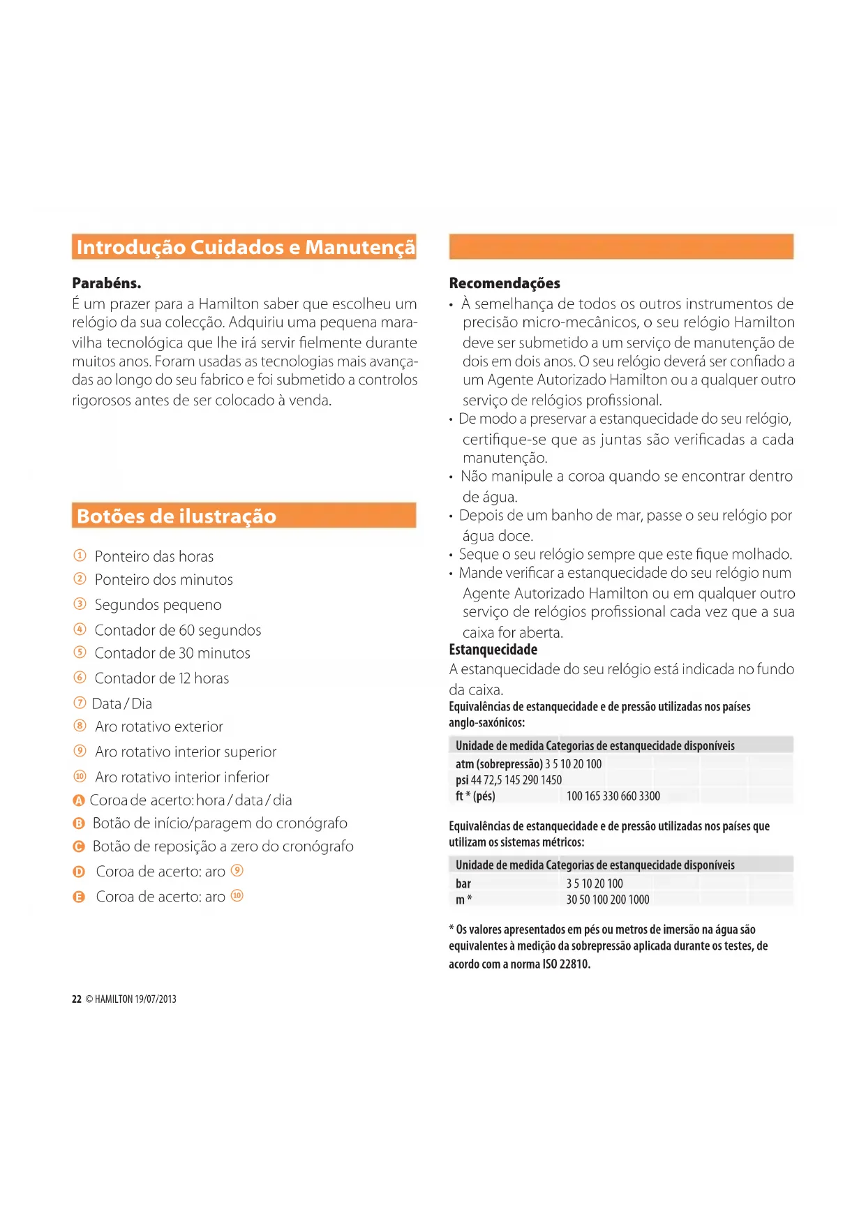 Cuando el viento sople por la derecha, añada el ángulo de deriva al rumbo magnético. Cuando el viento sople por la izquierda, reste el ángulo de deriva al rumbo magnético. Ej.: Rumbo corregido: 40º + 6,5º = 46,5º Para su memorización, use la corona E para indicar el rumbo corregido (46,5º) sobre el bisel rotatorio interior inferior 0. Instrucciones de funcionamiento22 © HAMILTON 19/07/2013 Introdução Cuidados e Manutenção Parabéns. É um prazer para a Hamilton saber que escolheu um relógio da sua colecção. Adquiriu uma pequena mara- vilha tecnológica que lhe irá servir elmente durante muitos anos. Foram usadas as tecnologias mais avança- das ao longo do seu fabrico e foi submetido a controlos rigorosos antes de ser colocado à venda. Botões de ilustração 1 Ponteiro das horas 2 Ponteiro dos minutos 3 Segundos pequeno 4 Contador de 60 segundos 5 Contador de 30 minutos 6 Contador de 12 horas 7 Data / Dia 8 Aro rotativo exterior 9 Aro rotativo interior superior 0 Aro rotativo interior inferior A Coroa de acerto: hora / data / dia B Botão de início/paragem do cronógrafo C Botão de reposição a zero do cronógrafo D Coroa de acerto: aro 9 E Coroa de acerto: aro 0 Recomendações