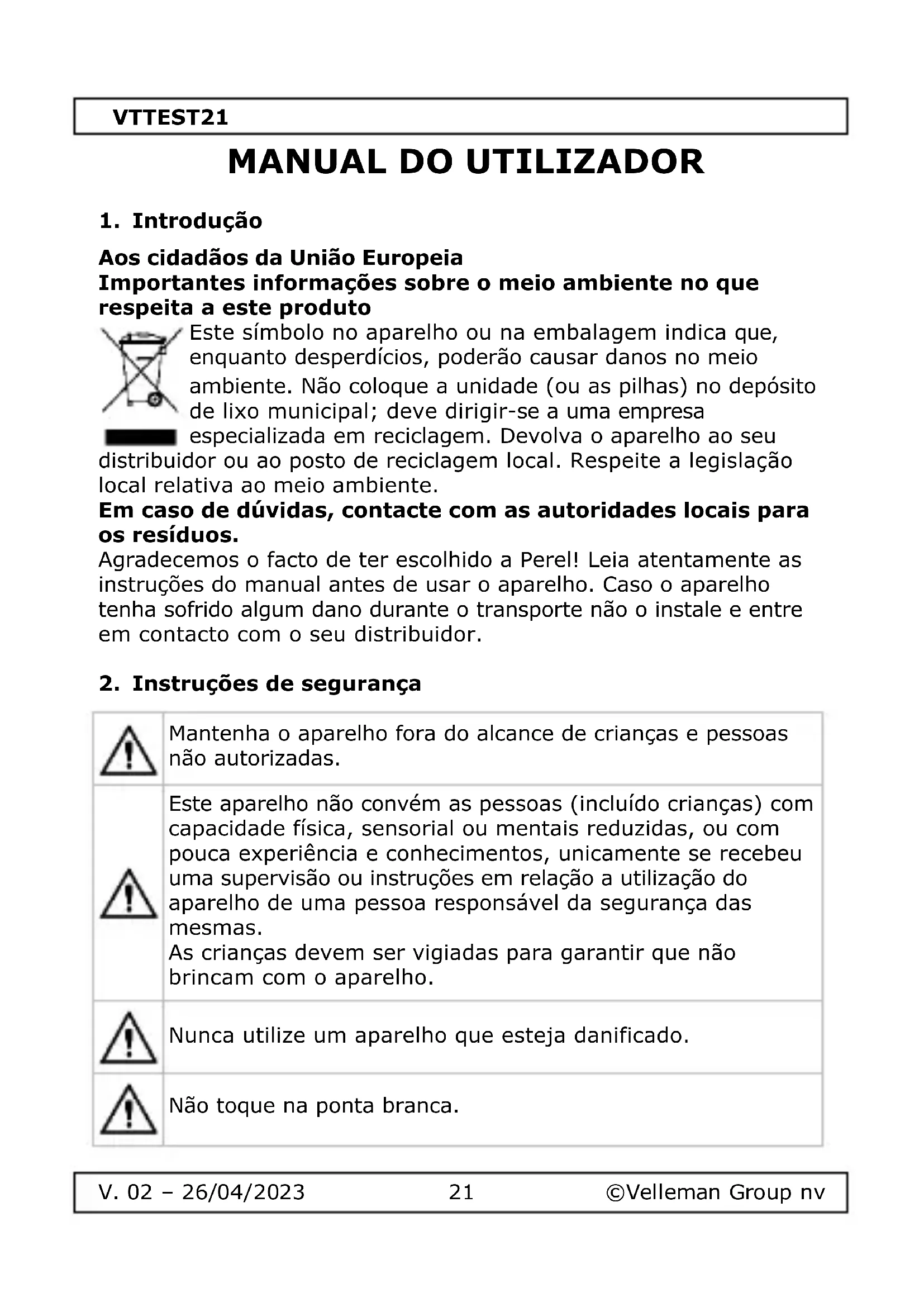 Encontre gratuitamente o manual do aparelho VTTEST21 VELLEMAN em formato PDF.