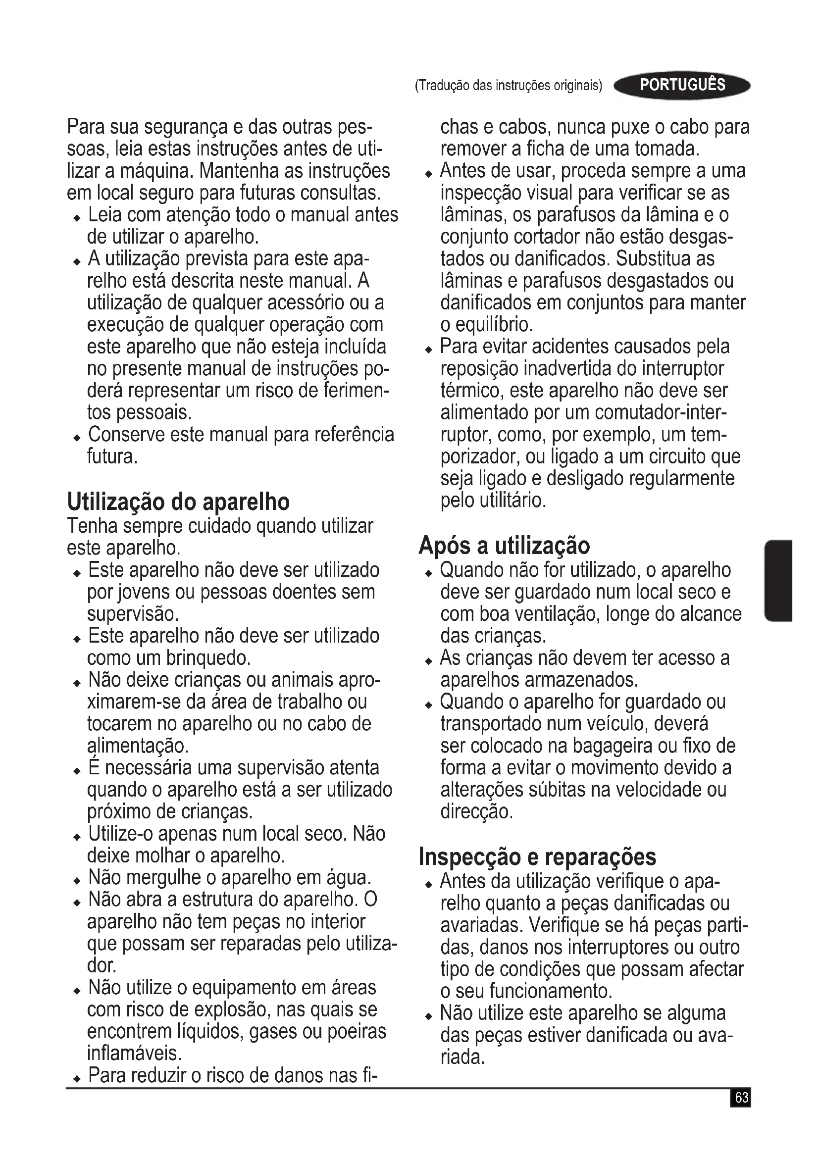Nunca levante ou transporte um aparelho quando o motor estiver em funcionamento. Símbolos de aviso Os seguintes símbolos de aviso apre- sentam os seguintes símbolos de aviso juntamente com o código de data: Atenção! Antes de utilizar o aparelho, leia o manual. Não exponha o aparelho à chu- va ou humidade elevada. Esteja atento a lâminas aa- das. As lâminas continuam a rodar após o motor ter sido desligado – Remova a cha da corrente eléctrica antes da manutenção ou se o cabo estiver danicado. Esteja atento à projecção de objectos. Mantenha as pessoas afastadas da área de corte. Use uma protecção ocular ade- quada. Use uma protecção auricular adequada. As lâminas continuarão a rodar após a máquina ter sido desli- gada.67 (Tradução das instruções originais) PORTUGUÊS Mantenha o cabo de alimenta- ção afastado das lâminas de corte. A potência sonora está em conformidade com a Directiva 2000/14/CE. Segurança eléctrica