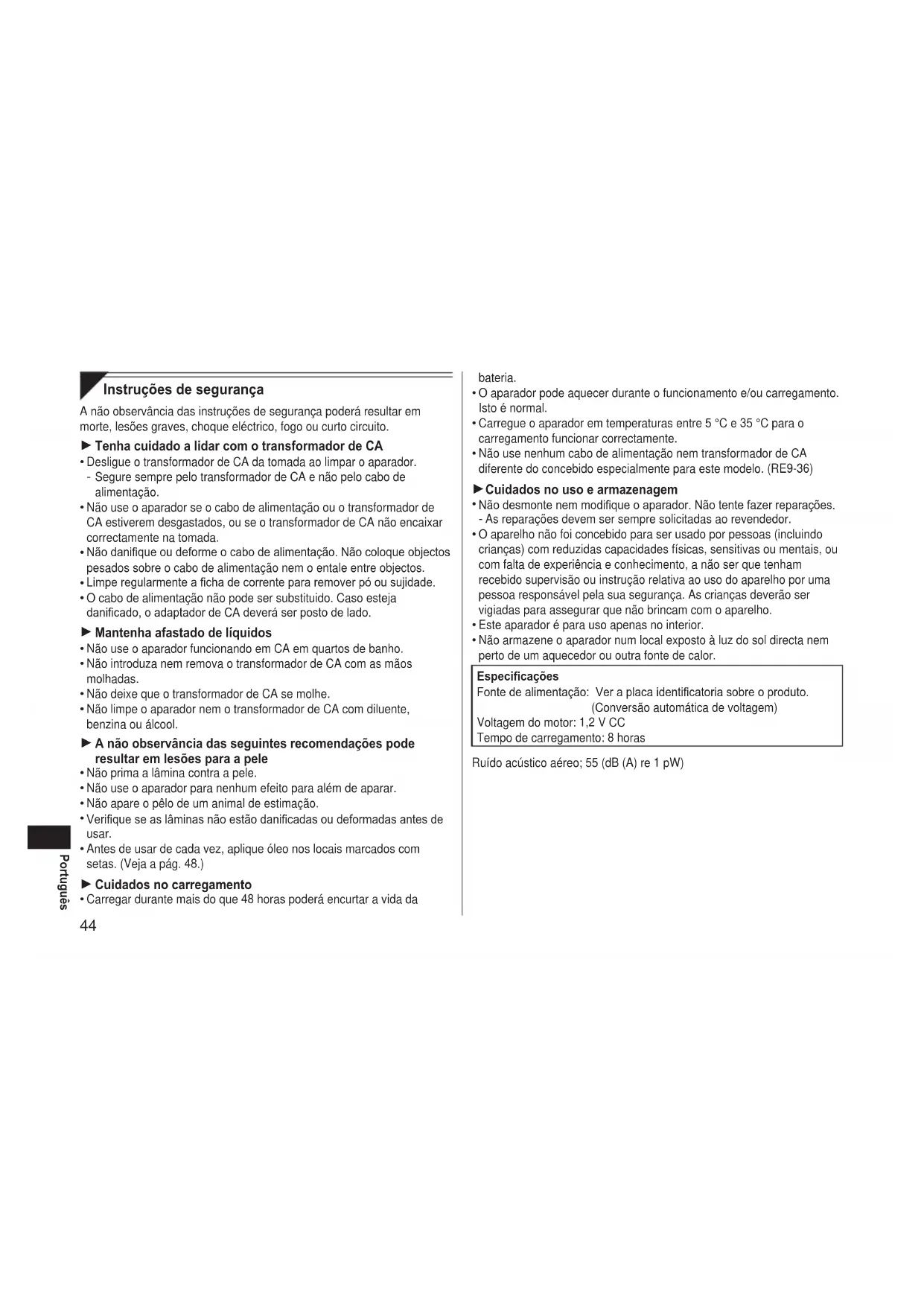 bateria. O aparador pode aquecer durante o funcionamento e/ou carregamento. Isto é normal. Carregue o aparador em temperaturas entre 5 °C e 35 °C para o carregamento funcionar correctamente. Não use nenhum cabo de alimentação nem transformador de CA diferente do concebido especialmente para este modelo. (RE9‑36) Cuidados no uso e armazenagem Não desmonte nem modique o aparador. Não tente fazer reparações. As reparações devem ser sempre solicitadas ao revendedor. O aparelho não foi concebido para ser usado por pessoas (incluindo crianças) com reduzidas capacidades físicas, sensitivas ou mentais, ou com falta de experiência e conhecimento, a não ser que tenham recebido supervisão ou instrução relativa ao uso do aparelho por uma pessoa responsável pela sua segurança. As crianças deverão ser vigiadas para assegurar que não brincam com o aparelho. Este aparador é para uso apenas no interior. Não armazene o aparador num local exposto à luz do sol directa nem perto de um aquecedor ou outra fonte de calor. Especicações Fonte de alimentação: Ver a placa identicatoria sobre o produto. (Conversão automática de voltagem) Voltagem do motor: 1,2 V CC Tempo de carregamento: 8 horas Ruído acústico aéreo; 55 (dB (A) re 1 pW)