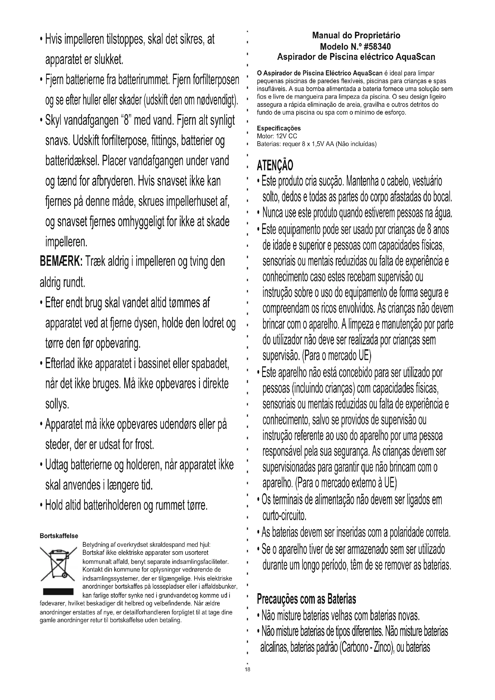 - Hold altid batteriholderen og rummet tørre.Fig.3 Nota: Os desenhos servem apenas para fins ilustrativos. Podem não ilustrar o produto real. Não está à escala. Configuração do Produto Aspirador Montagem da Escova Alinhe a curvatura da escova com a cabeça de sucção e insira a escova na mesma de forma segura (Fig.1). Montagem da Cabeça de Sucção Elimine cuidadosamente a embalagem de cartão em volta do rotor. Não tente arrancar directamente a embalagem, mas antes corte-a e desenrole-a. Qualquer dano ao rotor pode causar que este funcione indevidamente. Aparafuse a cabeça de sucção em segurança ao conector roscado como ilustrado (Fig.2). Montagem das Baterias Desaparafuse a tampa de baterias e retire o suporte de baterias. Coloque 8 baterias AA no suporte de baterias de acordo com a polaridade assinalada no mesmo. Alinhe a aleta e deslize o suporte de baterias para o compartimento com a palavra “TOP” voltada para fora como ilustrado (Fig.3). Aparafuse a tampa das baterias de forma justa e certifique-se que está segura (evite descarnar o parafuso). CUIDADO: Não pressione o botão para ligar o produto até que o limpador esteja imerso em água e o nível da água está acima da saída de água. Limpeza da sua Piscina ou Spa Coloque o produto na água e certifique-se que o nível da água está acima da saída de água. Pode ajustar o comprimento do produto desaparafusando o fecho da haste para libertar a haste superior e depois estendê-la até ao comprimento pretendido de acordo com o tamanho da sua piscina ou spa. Prenda apertando o fecho da haste. Pressione a marca “I” no botão para começar a aspirar. CUIDADO: Nunca mergulhe o manípulo em água. Durante a operação, evite o contacto da água com o manípulo e botão. Nunca utilize o produto sem o cesto de filtro no seu Manual do Proprietário Modelo N.º #58340 Aspirador de Piscina eléctrico AquaScan O Aspirador de Piscina Eléctrico AquaScan é ideal para limpar pequenas piscinas de paredes flexíveis, piscinas para crianças e spas insufláveis. A sua bomba alimentada a bateria fornece uma solução sem fios e livre de mangueira para limpeza da piscina. O seu design ligeiro assegura a rápida eliminação de areia, gravilha e outros detritos do fundo de uma piscina ou spa com o mínimo de esforço. Especificações Motor: 12V CC Baterias: requer 8 x 1,5V AA (Não incluídas) ATENÇÃO