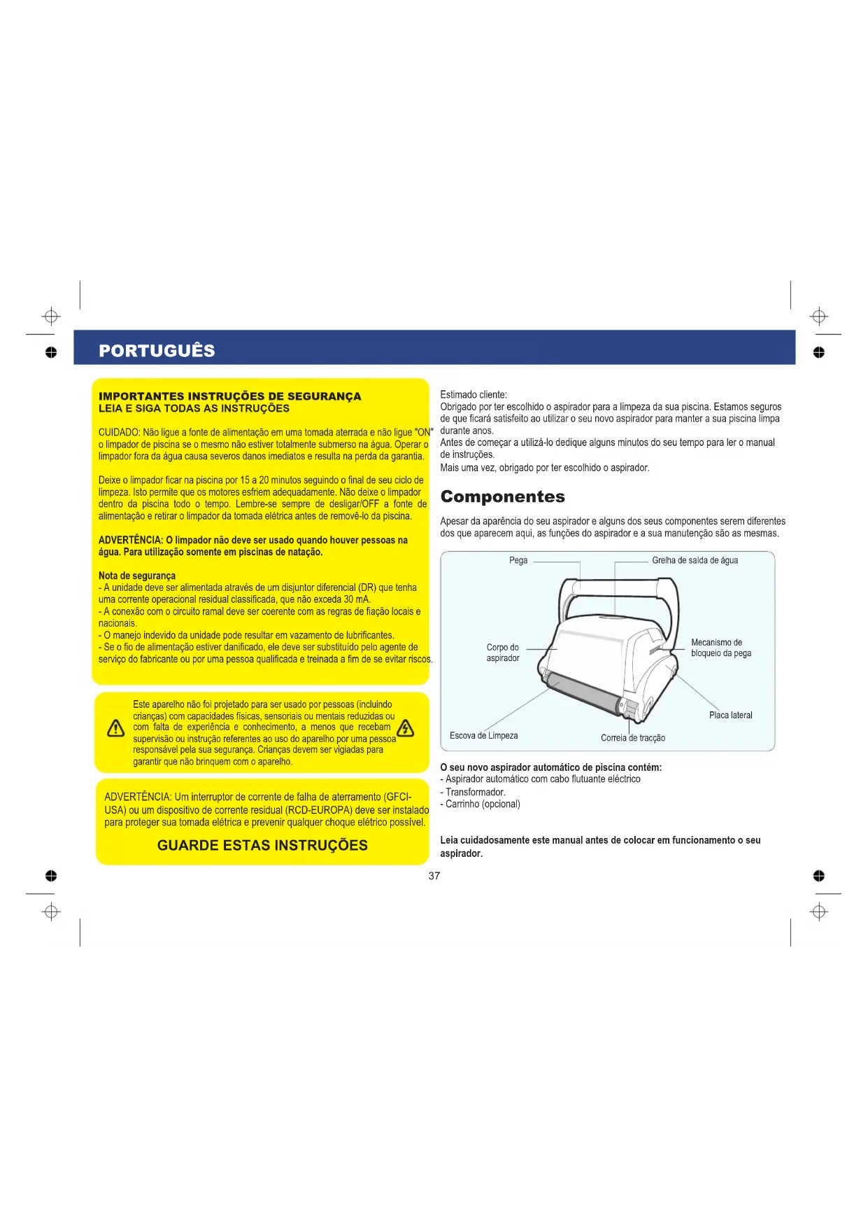 Componentes O seu novo aspirador automático de piscina contém: - Aspirador automático com cabo flutuante eléctrico - Transformador. - Carrinho (opcional) Leia cuidadosamente este manual antes de colocar em funcionamento o seu aspirador. Apesar da aparência do seu aspirador e alguns dos seus componentes serem diferentes dos que aparecem aqui, as funções do aspirador e a sua manutenção são as mesmas. Pega Grelha de saída de águaCorpo do aspiradorMecanismo de bloqueio da pegaPlaca lateralCorreia de tracçãoEscova de Limpeza Estimado cliente: Obrigado por ter escolhido o aspirador para a limpeza da sua piscina. Estamos seguros de que ficará satisfeito ao utilizar o seu novo aspirador para manter a sua piscina limpa durante anos. Antes de começar a utilizá-lo dedique alguns minutos do seu tempo para ler o manual de instruções. Mais uma vez, obrigado por ter escolhido o aspirador. IMPORTANTES INSTRUÇÕES DE SEGURANÇA LEIA E SIGA TODAS AS INSTRUÇÕESCUIDADO: Não ligue a fonte de alimentação em uma tomada aterrada e não ligue "ON" o limpador de piscina se o mesmo não estiver totalmente submerso na água. Operar o limpador fora da água causa severos danos imediatos e resulta na perda da garantia.Deixe o limpador ficar na piscina por 15 a 20 minutos seguindo o final de seu ciclo de limpeza. Isto permite que os motores esfriem adequadamente. Não deixe o limpador dentro da piscina todo o tempo. Lembre-se sempre de desligar/OFF a fonte de alimentação e retirar o limpador da tomada elétrica antes de removê-lo da piscina.ADVERTÊNCIA: O limpador não deve ser usado quando houver pessoas na água. Para utilização somente em piscinas de natação.Nota de segurança- A unidade deve ser alimentada através de um disjuntor diferencial (DR) que tenha uma corrente operacional residual classificada, que não exceda 30 mA.- A conexão com o circuito ramal deve ser coerente com as regras de fiação locais e nacionais.- O manejo indevido da unidade pode resultar em vazamento de lubrificantes.- Se o fio de alimentação estiver danificado, ele deve ser substituído pelo agente de serviço do fabricante ou por uma pessoa qualificada e treinada a fim de se evitar riscos. ADVERTÊNCIA: Um interruptor de corrente de falha de aterramento (GFCI- USA) ou um dispositivo de corrente residual (RCD-EUROPA) deve ser instalado para proteger sua tomada elétrica e prevenir qualquer choque elétrico possível. Este aparelho não foi projetado para ser usado por pessoas (incluindo crianças) com capacidades físicas, sensoriais ou mentais reduzidas ou com falta de experiência e conhecimento, a menos que recebam supervisão ou instrução referentes ao uso do aparelho por uma pessoa responsável pela sua segurança. Crianças devem ser vigiadas para garantir que não brinquem com o aparelho. GUARDE ESTAS INSTRUÇÕES1. Coloque a alimentação eléctrica (transformador) a ao menos 3,6 metros / 11,8 pés da piscina e ao menos a 12 cm / 4 polegadas acima da superfície (fig. 1). O transformador fornecerá baixa voltagem ao limpador.