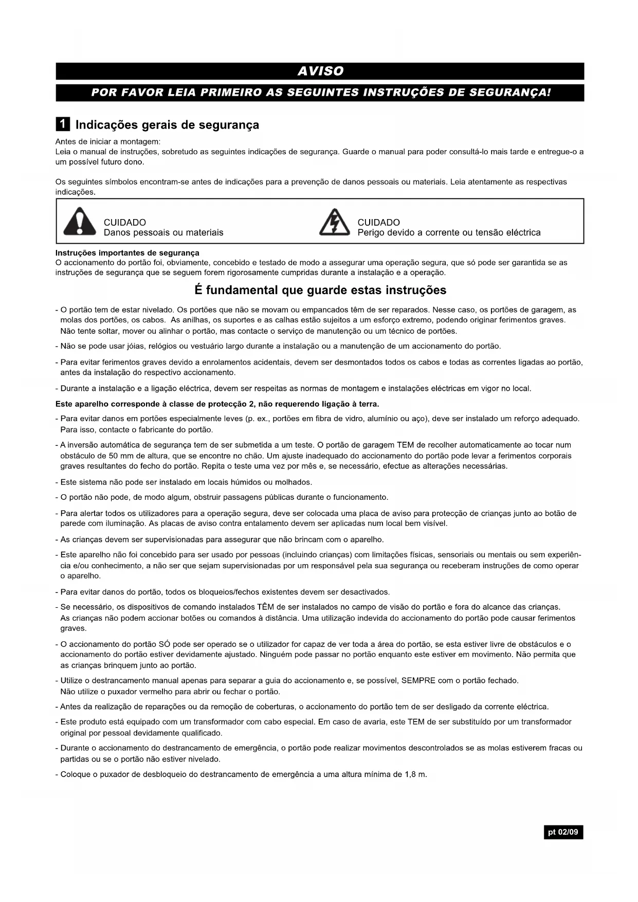 POR FAVOR LEIA PRIMEIRO AS SEGUINTES INSTRUÇÕES DE SEGURANÇA! AVISO pt 02/09Utilização apropriada O aparelho destina-se à abertura e ao fecho de portões de garagem basculantes e seccionais no sector privado. O aparelho não está pre- visto nem é apropriado para a utilização industrial, destinando-se exclusivamente a portões de garagens de casas particulares. Qualquer utilização do accionamento que não a prevista implica riscos elevados de acidente. O fabricante não assume qualquer responsabili- dade no caso de utilização inadequada. Equipamento fornecido Antes da montagem, verifique a integridade das peças fornecidas. Nota: A numeração aplica-se apenas aos capítulos correspondentes. Visão geral do produto Esta fig. oferece-lhe uma visão geral do sistema completamente mon- tado, que pode sempre consultar durante o processo de montagem. Antes de começar NOTA IMPORTANTE Se a sua garagem não tiver nenhuma entrada lateral, tem de ser insta- lado um destrancamento externo de emergência. No caso de falha de corrente, este assegura a operação manual do portão da garagem pelo lado de fora. Requisitos O sistema de abertura do portão de garagem é adequado apenas para a montagem de portões de garagem de uma só peça com calha guia (portão basculante) (Fig. A) e para portões seccionais com calha guia curvada (Fig. B). Nota: O sistema não pode ser usado em portões de garagem de uma só peça com calhas guia horizontais e verticais, portões de dois batentes ou portões basculantes sem oscilação para fora. Preparação Verifique primeiro se o seu portão não balança e está nivelado. Abra-o aproximadamente até metade e solte-o. O portão não se pode mexer muito por si próprio, tendo de permanecer na respectiva posição, seguro apenas pela força das molas. Força de movimento: no máximo 15kg.