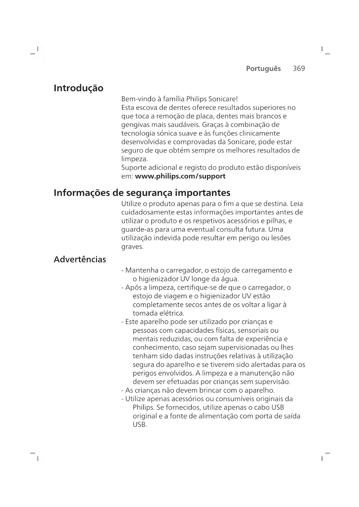 Português Introdução Bem-vindo à família Philips Sonicare! Esta escova de dentes oferece resultados superiores no que toca a remoção de placa, dentes mais brancos e gengivas mais saudáveis. Graças à combinação de tecnologia sónica suave e às funções clinicamente desenvolvidas e comprovadas da Sonicare, pode estar seguro de que obtém sempre os melhores resultados de limpeza. Suporte adicional e registo do produto estão disponíveis em: www.philips.com/support Informações de segurança importantes Utilize o produto apenas para o fim a que se destina. Leia cuidadosamente estas informações importantes antes de utilizar o produto e os respetivos acessórios e pilhas, e guarde-as para uma eventual consulta futura. Uma utilização indevida pode resultar em perigo ou lesões graves. Advertências - Mantenha o carregador, o estojo de carregamento e o higienizador UV longe da água. - Após a limpeza, certifique-se de que o carregador, o estojo de viagem e o higienizador UV estão completamente secos antes de os voltar a ligar à tomada elétrica. - Este aparelho pode ser utilizado por crianças e pessoas com capacidades físicas, sensoriais ou mentais reduzidas, ou com falta de experiência e conhecimento, caso sejam supervisionadas ou lhes tenham sido dadas instruções relativas à utilização segura do aparelho e se tiverem sido alertadas para os perigos envolvidos. A limpeza e a manutenção não devem ser efetuadas por crianças sem supervisão. - As crianças não devem brincar com o aparelho. - Utilize apenas acessórios ou consumíveis originais da Philips. Se fornecidos, utilize apenas o cabo USB original e a fonte de alimentação com porta de saída USB.370 Português - Este aparelho não contém peças passíveis de assistência pelo utilizador. Se o aparelho estiver danificado, não o utilize e contacte o Centro de Apoio ao Cliente no seu país (consultar «Garantia e assistência»). - Se o cabo USB ou a fonte de alimentação USB apresentar danos, não os utilize. - Não utilize o carregador, o estojo de viagem e/ou o higienizador UV ao ar livre nem perto de superfícies aquecidas. - Não lave nenhuma das peças do produto na máquina de lavar a loiça. - Este aparelho destina-se unicamente à lavagem dos dentes, gengivas e língua. - Mantenha sempre o higienizador UV fora do alcance das crianças. - Pare de utilizar o higienizador UV se a lâmpada/LED UV permanecer acesa quando o higienizador UV está aberto. A luz UV pode ser prejudicial para os olhos e a pele humana. - Utilize apenas o higienizador com a estrutura de proteção colocada. - Não toque na lâmpada UV do higienizador UV enquanto esta estiver quente. - Interrompa a utilização da cabeça de escovagem se esta apresentar cerdas esmagadas ou dobradas. Substitua a cabeça de escovagem de 3 em 3 meses ou mais cedo no caso de aparecerem sinais de desgaste. - Evite o contacto direto com produtos que contenham óleos essenciais ou óleo de coco. Um contacto deste tipo pode resultar no deslocamento das cerdas. - A altitude máxima de utilização reside nos 4500 metros.