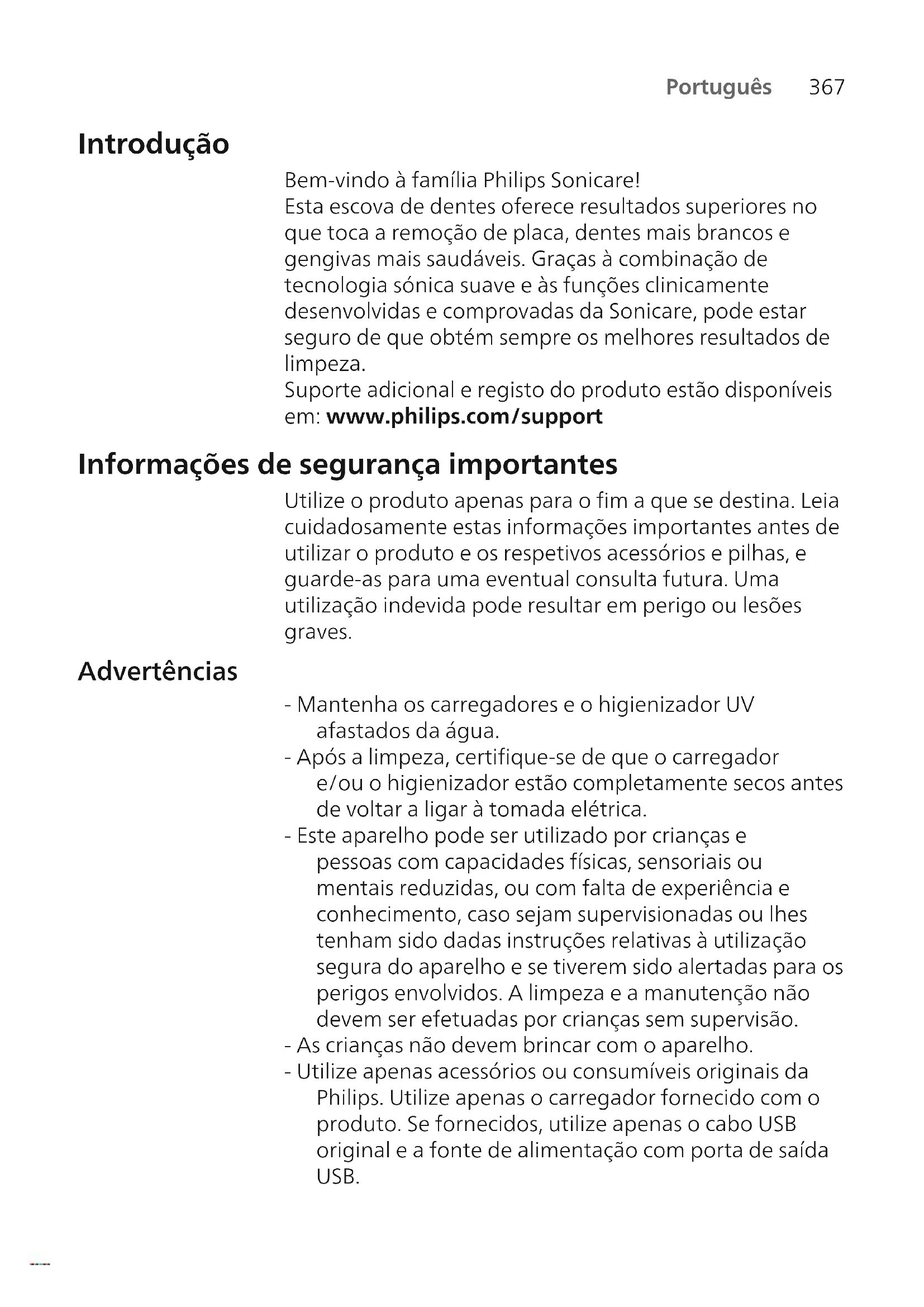 Português Introdução Bem-vindo à família Philips Sonicare! Esta escova de dentes oferece resultados superiores no que toca a remoção de placa, dentes mais brancos e gengivas mais saudáveis. Graças à combinação de tecnologia sónica suave e às funções clinicamente desenvolvidas e comprovadas da Sonicare, pode estar seguro de que obtém sempre os melhores resultados de limpeza. Suporte adicional e registo do produto estão disponíveis em: www.philips.com/support Informações de segurança importantes Utilize o produto apenas para o fim a que se destina. Leia cuidadosamente estas informações importantes antes de utilizar o produto e os respetivos acessórios e pilhas, e guarde-as para uma eventual consulta futura. Uma utilização indevida pode resultar em perigo ou lesões graves. Advertências - Mantenha os carregadores e o higienizador UV afastados da água. - Após a limpeza, certifique-se de que o carregador e/ou o higienizador estão completamente secos antes de voltar a ligar à tomada elétrica. - Este aparelho pode ser utilizado por crianças e pessoas com capacidades físicas, sensoriais ou mentais reduzidas, ou com falta de experiência e conhecimento, caso sejam supervisionadas ou lhes tenham sido dadas instruções relativas à utilização segura do aparelho e se tiverem sido alertadas para os perigos envolvidos. A limpeza e a manutenção não devem ser efetuadas por crianças sem supervisão. - As crianças não devem brincar com o aparelho. - Utilize apenas acessórios ou consumíveis originais da Philips. Utilize apenas o carregador fornecido com o produto. Se fornecidos, utilize apenas o cabo USB original e a fonte de alimentação com porta de saída USB.368 Português - Este aparelho não contém peças passíveis de assistência pelo utilizador. Se o aparelho estiver danificado, não o utilize e contacte o Centro de Apoio ao Cliente no seu país. Apenas para dispositivos com cabo: Se o cabo estiver danificado, substitua o carregador com higienizador por um novo. - Não utilize o carregador e/ou o higienizador ao ar livre nem junto de superfícies aquecidas. - Não lave nenhuma das peças do produto na máquina de lavar a loiça. - Este aparelho destina-se unicamente à lavagem dos dentes, gengivas e língua. - Mantenha sempre o higienizador fora do alcance das crianças. - Pare de utilizar o higienizador se a lâmpada UV permanecer acesa quando a porta está aberta. A luz UV pode ser prejudicial para os olhos e a pele humana. - Utilize apenas o higienizador com a estrutura de proteção colocada. - Não toque na lâmpada UV do higienizador UV enquanto esta estiver quente. - Interrompa a utilização da cabeça de escovagem se esta apresentar cerdas esmagadas ou dobradas. Substitua a cabeça de escovagem de 3 em 3 meses ou mais cedo no caso de aparecerem sinais de desgaste. - Evite o contacto direto com produtos que contenham óleos essenciais ou óleo de coco. Um contacto deste tipo pode resultar no deslocamento das cerdas. - Não utilize o aparelho e consulte o seu dentista/médico se ocorrer uma hemorragia excessiva após a utilização, se o sangramento continuar a ocorrer após 1 semana de utilização ou se sentir desconforto ou dor. - Se tiver sido submetido a uma cirurgia oral ou das gengivas nos últimos 2 meses, consulte o seu dentista antes de utilizar este aparelho. - Se tiver um pacemaker ou outro dispositivo implantado, consulte o seu médico ou o fabricante do dispositivo implantado antes da utilização.369 Português - Se tiver problemas de saúde, consulte o seu médico antes de utilizar este aparelho. - Este aparelho é um dispositivo de uso pessoal, pelo que não deve ser usado em vários pacientes em consultórios ou clínicas dentárias. Instruções de segurança relativas às pilhas - Este aparelho contém pilhas recarregáveis que só podem ser substituídas por técnicos qualificados. - Utilize o produto apenas para o fim a que se destina. Leia cuidadosamente estas informações antes de utilizar o produto e os respetivos acessórios e baterias, e guarde-as para uma eventual consulta futura. Uma utilização indevida pode resultar em perigo ou lesões graves. Os acessórios fornecidos podem variar consoante os produtos. - Utilize apenas acessórios e consumíveis originais da Philips. Utilize apenas uma unidade de alimentação amovível TCBxxxx, HX6100, HX6110, HX6160 ou WAAxxxx. - Mantenha o produto e as pilhas afastados de fonte de calor, e não os exponha à luz solar direta nem a altas temperaturas. - Se o produto aquecer anormalmente ou emanar um odor desagradável, mudar de cor ou o tempo de carregamento for muito superior ao habitual, não utilize nem carregue o produto e contacte a Philips. - Não coloque os produtos e as respetivas pilhas em fornos de micro-ondas ou placas de indução. - Para impedir que as pilhas aqueçam ou libertem substâncias tóxicas ou perigosas, não abra, modifique, perfure, danifique ou desmonte o produto ou a bateria. Não cause curto-circuitos, não carregue excessivamente nem inverta a corrente das pilhas. - Este aparelho contém baterias que não são substituíveis. Quando a bateria se esgotar, o aparelho deve ser eliminado em conformidade. Consulte a secção sobre reciclagem. - Se as pilhas estiverem danificadas ou com fugas, evite o contacto com a pele ou os olhos. Caso isto ocorra, lave imediatamente com água e procure assistência médica.370 Português - Quando manusear pilhas, certifique-se de que as suas mãos, o produto e as pilhas estão secos. - Para evitar um curto-circuito acidental das pilhas após a respetiva remoção, evite o contacto dos respetivos terminais com objetos metálicos (por exemplo, moedas, ganchos de cabelo, anéis). Não envolva as pilhas em folhas de alumínio. Isole os terminais das pilhas ou coloque-as num saco de plástico antes de as descartar. - Carregue e utilize o produto a uma temperatura entre 0°C e 40°C. Condições de armazenamento e tra