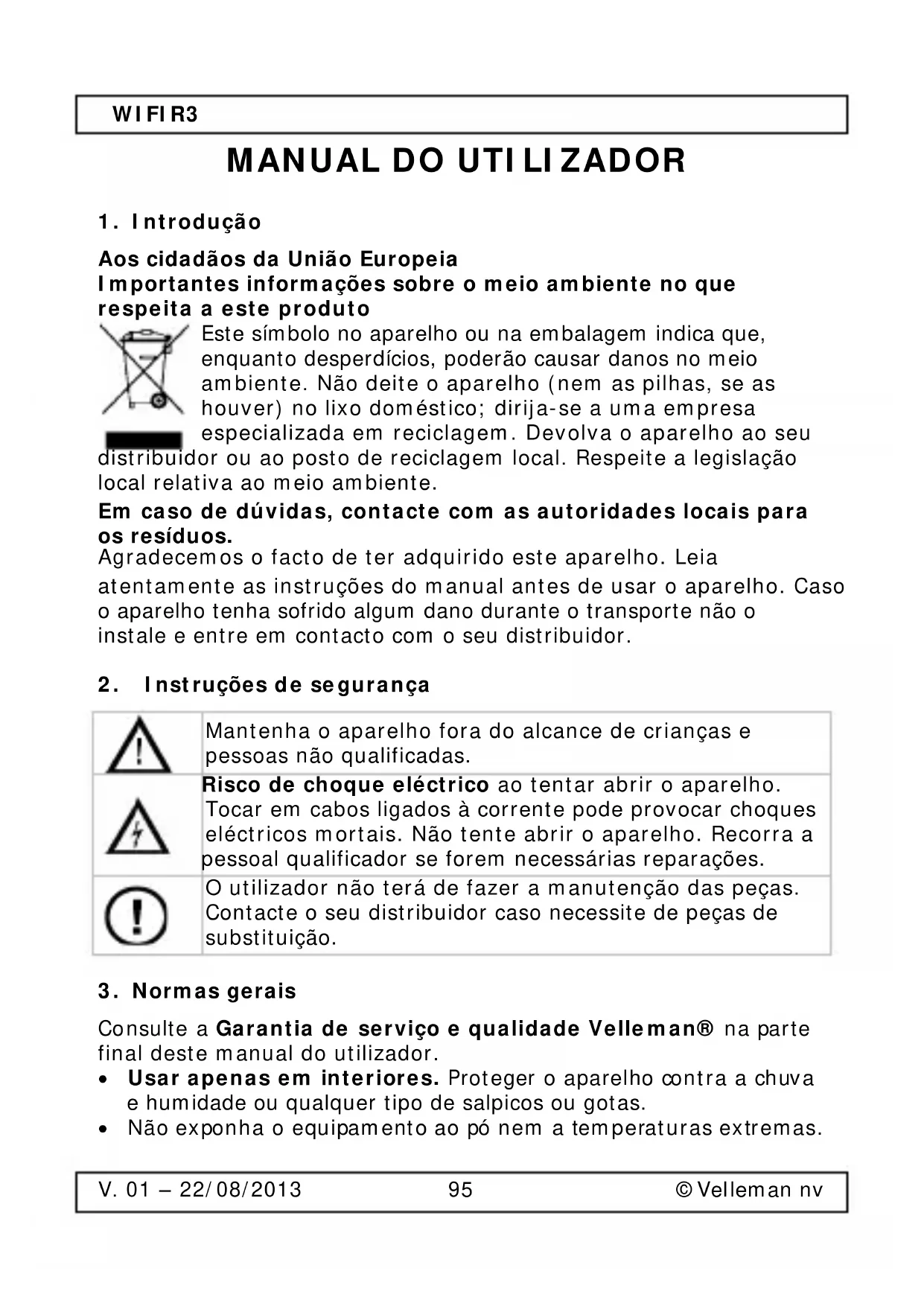 Encontre gratuitamente o manual do aparelho WIFIR3 VELLEMAN em formato PDF.