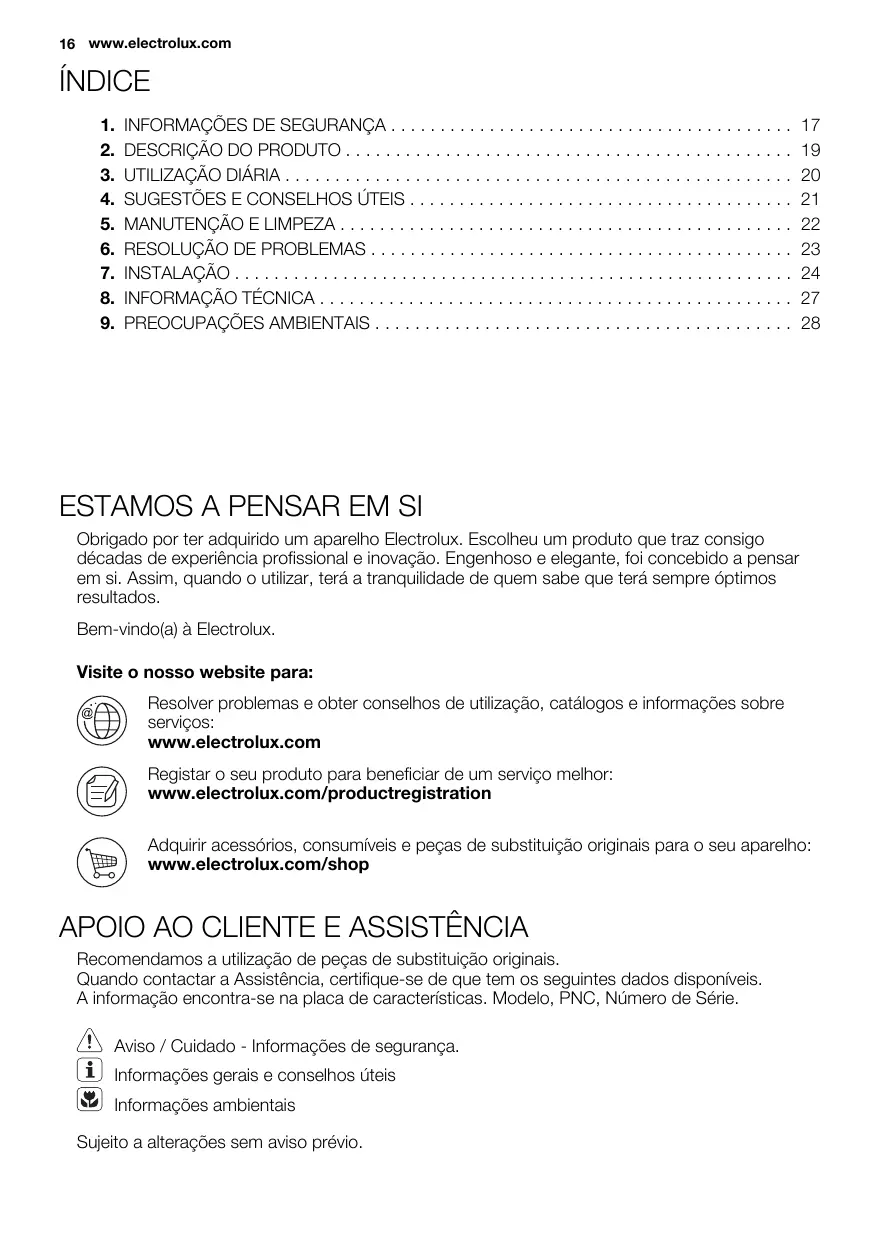 Obrigado por ter adquirido um aparelho Electrolux. Escolheu um produto que traz consigo décadas de experiência profissional e inovação. Engenhoso e elegante, foi concebido a pensar em si. Assim, quando o utilizar, terá a tranquilidade de quem sabe que terá sempre óptimos resultados. Bem-vindo(a) à Electrolux. Visite o nosso website para: Resolver problemas e obter conselhos de utilização, catálogos e informações sobre serviços: www.electrolux.com Registar o seu produto para beneficiar de um serviço melhor: www.electrolux.com/productregistration Adquirir acessórios, consumíveis e peças de substituição originais para o seu aparelho: www.electrolux.com/shop
