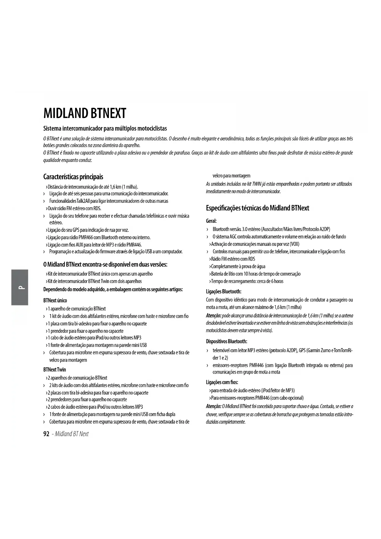 segundo e depois voltará ao modo de programação (luz vermelha sempre acesa). A unidade BTNext está agora pronta para outro procedimento de emparelhamento e pode emparelhar outra unidade BT seguindo o mesmo procedimento, mas utilizando um botão diferente no BTNext. Se não tiver mais dispositivos para emparelhar, tem de sair do modo de programação antes de usar as unidades: efectue duplo clique no botão “Middle” (meio), a luz vermelha irá desligar-se e a luz azul irá começar a piscar. Pode agora utilizar o seu BTNext. Emparelhar o BTNext a dispositivos Bluetooth O aparelho BTNext pode ser emparelhado a outros dispositivos Bluetooth, como o telefone, o navegador GPS ou o rádio PMR446 com Bluetooth externo incorporado. O procedimento de emparelhamento tem de ser efectuado utilizando os botões “Volume +” ou “Volume -“. › Emparelhar ao botão “Volume +”: para telefone com música (estéreo A2DP). Todos os dispositivos emparelhados ao botão “Volume +” têm uma prioridade superior e irão interromper todas as outras comunicações (como por exemplo, o intercomunicador, o rádio FM e a música). Talk2All Universal Intercom 1Talk2All Universal Intercom 2Talk2All - Universal Intercom Not Midland UnitTalk2All - Universal Intercom Midland Unit paired as a phonePassangerP Midland BT Next - 99 › Emparelhar ao botão “Volume -”: para navegadores GPS e outros dispositivos cujo áudio deve ser sempre de fundo. Atenção: o botão “Volume -” não suporta a emparelhamento a um telefone. Emparelhar a um telefone O telemóvel apenas pode ser emparelhado ao botão do “Volume +”, deste modo é possível gerir todas as funcionalidades do telefone e ouvir música estéreo. Uma chamada recebida tem prioridade superior, o que signica que todas as outras co- municações serão desactivadas (intercomunicador, música) Emparelhar a um navegador GPS O GPS pode ser emparelhado ao botão “Volume + “ ou ”Volume -” . Se o GPS for emparelhado ao “Volume +”, o anúncio de voz da rua irão interromper todas as outras comunicações (intercomunicador, música, Rádio FM...). Se o GPS for emparelhado no “Volume -“ todos os anúncios de voz da rua são sempre de fun- do (e não irão interromper as comunicações do intercomunicador). Neste caso, os anúncios de voz da rua do GPS são sempre de fundo (o intercomunicador não está desactivado) Navegador GPS com leitor de música estéreo Se o GPS também for um leitor MP3 estéreo e pretende ouvir música estéreo, deve empare- lhar o GPS ao botão “Volume +”. Nesta conguração os anúncios de voz da rua do GPS irão interromper todas as outras comunicações (intercomunicador, rádio FM e música). Quando o GPS estiver emparelhado ao botão “Volume +” o modo de “telefone” é activado. Atenção: É possível ouvir música estéreo A2DP no GPS apenas em “Modo Telefone”. Emparelhar a um rádio PMR446 com Bluetooth externo e integrado O rádio PMR446 tem de estar emparelhado ao botão “Volume -”, de modo a que o rádio PMR446 esteja sempre no fundo mesmo quando fala no intercomunicador. Atenção: para além de um emissor-receptor PMR446, se pretender ligar também um navegador GPS deve emparelhar o GPS ao botão “Volume +”. Nesta conguração os anúncios de voz da rua do GPS irão interromper todas as outras comunicações (interco- municador, rádio FM e música). Quando o GPS estiver emparelhado ao botão “Volume +” o modo de “telefone” é activado. Como emparelhar um BTNext a um telefone Para emparelhar o BTNext a um telefone, tem primeiro de entrar no modo de pro- gramação: