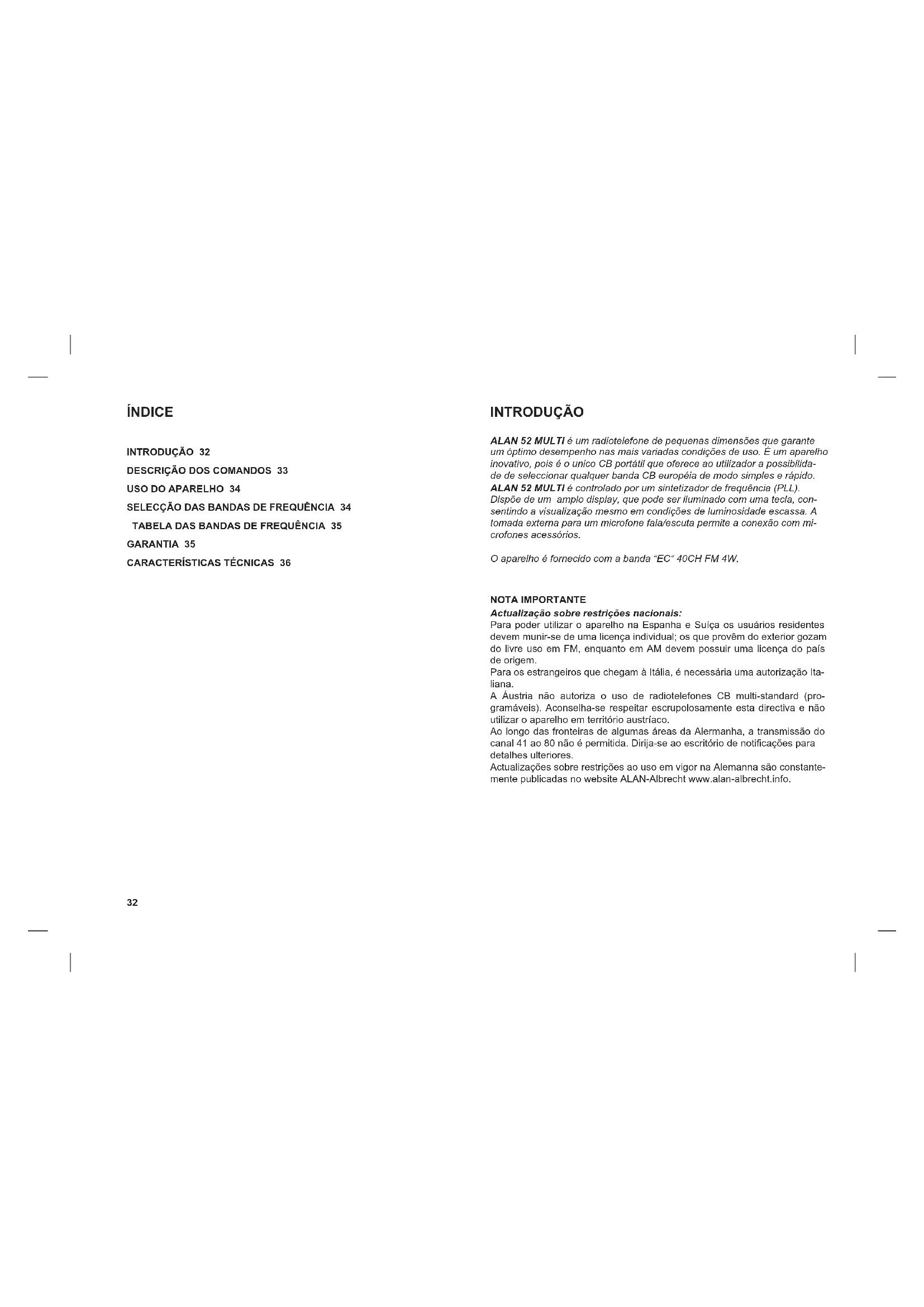 INTRODUÇÃO ALAN 52 MULTI é um radiotelefone de pequenas dimensões que garante um óptimo desempenho nas mais variadas condições de uso. É um aparelho inovativo, pois é o unico CB portátil que oferece ao utilizador a possibilida- de de seleccionar qualquer banda CB européia de modo simples e rápido. ALAN 52 MULTI é controlado por um sintetizador de frequência (PLL). Dispõe de um amplo display, que pode ser iluminado com uma tecla, con- sentindo a visualização mesmo em condições de luminosidade escassa. A tomada externa para um microfone fala/escuta permite a conexão com mi- crofones acessórios. O aparelho é fornecido com a banda “EC“ 40CH FM 4W. NOTA IMPORTANTE Actualização sobre restrições nacionais: Para poder utilizar o aparelho na Espanha e Suíça os usuários residentes devem munir-se de uma licença individual; os que provêm do exterior gozam do livre uso em FM, enquanto em AM devem possuir uma licença do país de origem. Para os estrangeiros que chegam à Itália, é necessária uma autorização Ita- liana. A Áustria não autoriza o uso de radiotelefones CB multi-standard (pro- gramáveis). Aconselha-se respeitar escrupolosamente esta directiva e não utilizar o aparelho em território austríaco. Ao longo das fronteiras de algumas áreas da Alermanha, a transmissão do canal 41 ao 80 não é permitida. Dirija-se ao escritório de noticações para detalhes ulteriores. Actualizações sobre restrições ao uso em vigor na Alemanna são constante- mente publicadas no website ALAN-Albrecht www.alan-albrecht.info.33