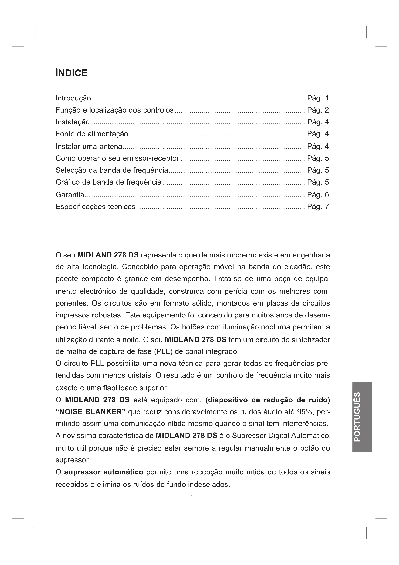 ÍNDICE Introdução.......................................................................................................Pág. 1 Função e localização dos controlos ...............................................................Pág. 2 Instalação ....................................................................................................... Pág. 4 Fonte de alimentação .....................................................................................Pág. 4 Instalar uma antena........................................................................................Pág. 4 Como operar o seu emissor-receptor ............................................................Pág. 5 Selecção da banda de frequência..................................................................Pág. 5 Gráfico de banda de frequência .....................................................................Pág. 5 Garantia ..........................................................................................................Pág. 6 Especificações técnicas .................................................................................Pág. 7 O seu MIDLAND 278 DS representa o que de mais moderno existe em engenharia de alta tecnologia. Concebido para operação móvel na banda do cidadão, este pacote compacto é grande em desempenho. Trata-se de uma peça de equipa- mento electrónico de qualidade, construída com perícia com os melhores com- ponentes. Os circuitos são em formato sólido, montados em placas de circuitos impressos robustas. Este equipamento foi concebido para muitos anos de desem- penho fiável isento de problemas. Os botões com iluminação nocturna permitem a utilização durante a noite. O seu MIDLAND 278 DS tem um circuito de sintetizador de malha de captura de fase (PLL) de canal integrado. O circuito PLL possibilita uma nova técnica para gerar todas as frequências pre- tendidas com menos cristais. O resultado é um controlo de frequência muito mais exacto e uma fiabilidade superior. O MIDLAND 278 DS está equipado com: (dispositivo de redução de ruído) “NOISE BLANKER” que reduz consideravelmente os ruídos áudio até 95%, per- mitindo assim uma comunicação nítida mesmo quando o sinal tem interferências. A novíssima característica de MIDLAND 278 DS é o Supressor Digital Automático, muito útil porque não é preciso estar sempre a regular manualmente o botão do supressor. O supressor automático permite uma recepção muito nítida de todos os sinais recebidos e elimina os ruídos de fundo indesejados.2 PORTUGUÊS