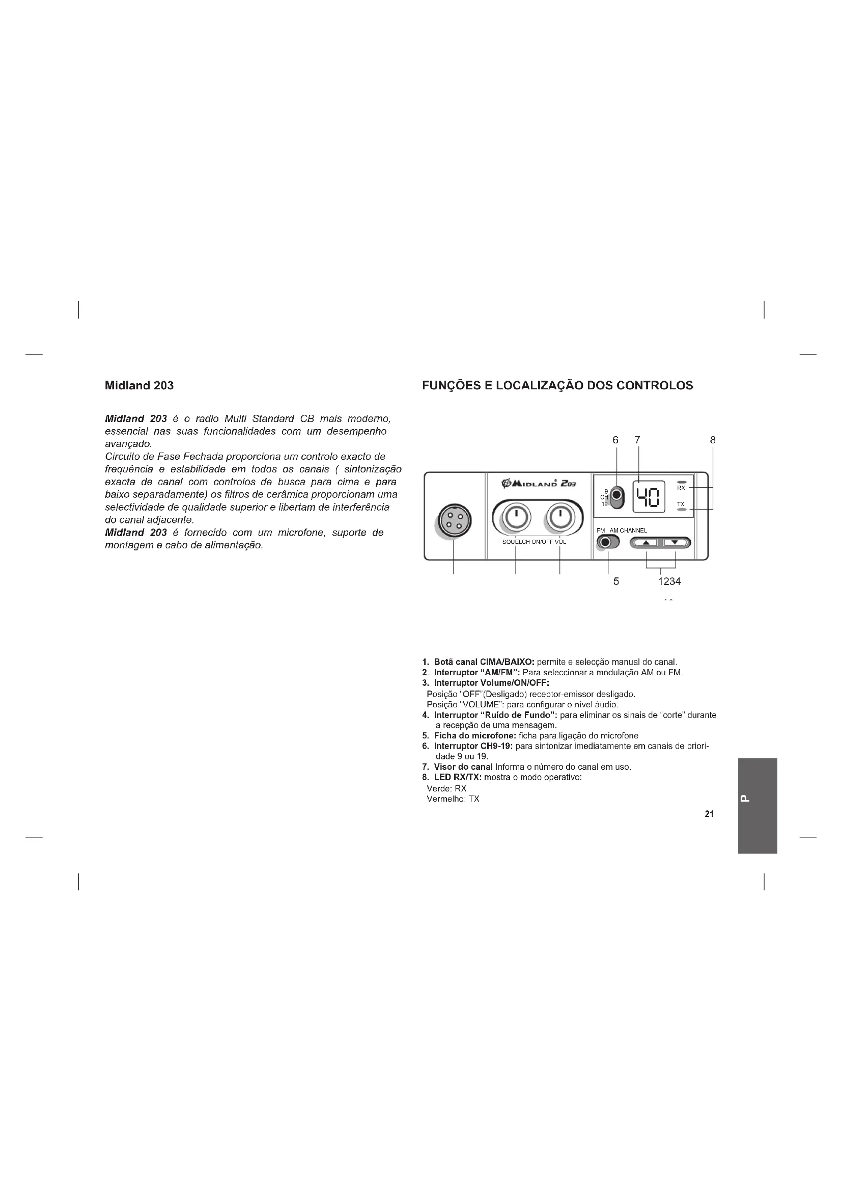 Midland 203 Midland 203 é o radio Multi Standard CB mais moderno, essencial nas suas funcionalidades com um desempenho avançado. Circuito de Fase Fechada proporciona um controlo exacto de frequência e estabilidade em todos os canais ( sintonização exacta de canal com controlos de busca para cima e para baixo separadamente) os ltros de cerâmica proporcionam uma selectividade de qualidade superior e libertam de interferência do canal adjacente. Midland 203 é fornecido com um microfone, suporte de montagem e cabo de alimentação. FUNÇÕES E LOCALIZAÇÃO DOS CONTROLOS 1. Botã canal CIMA/BAIXO: permite e selecção manual do canal.2. Interruptor “AM/FM”: Para seleccionar a modulação AM ou FM. 3. Interruptor Volume/ON/OFF: Posição “OFF”(Desligado) receptor-emissor desligado. Posição “VOLUME”: para congurar o nível áudio. 4. Interruptor “Ruído de Fundo”: para eliminar os sinais de “corte” durante a recepção de uma mensagem.5. Ficha do microfone: cha para ligação do microfone 6. Interruptor CH9-19: para sintonizar imediatamente em canais de priori-dade 9 ou 19.7. Visor do canal Informa o número do canal em uso.8. LED RX/TX: mostra o modo operativo: Verde: RX Vermelho: TX