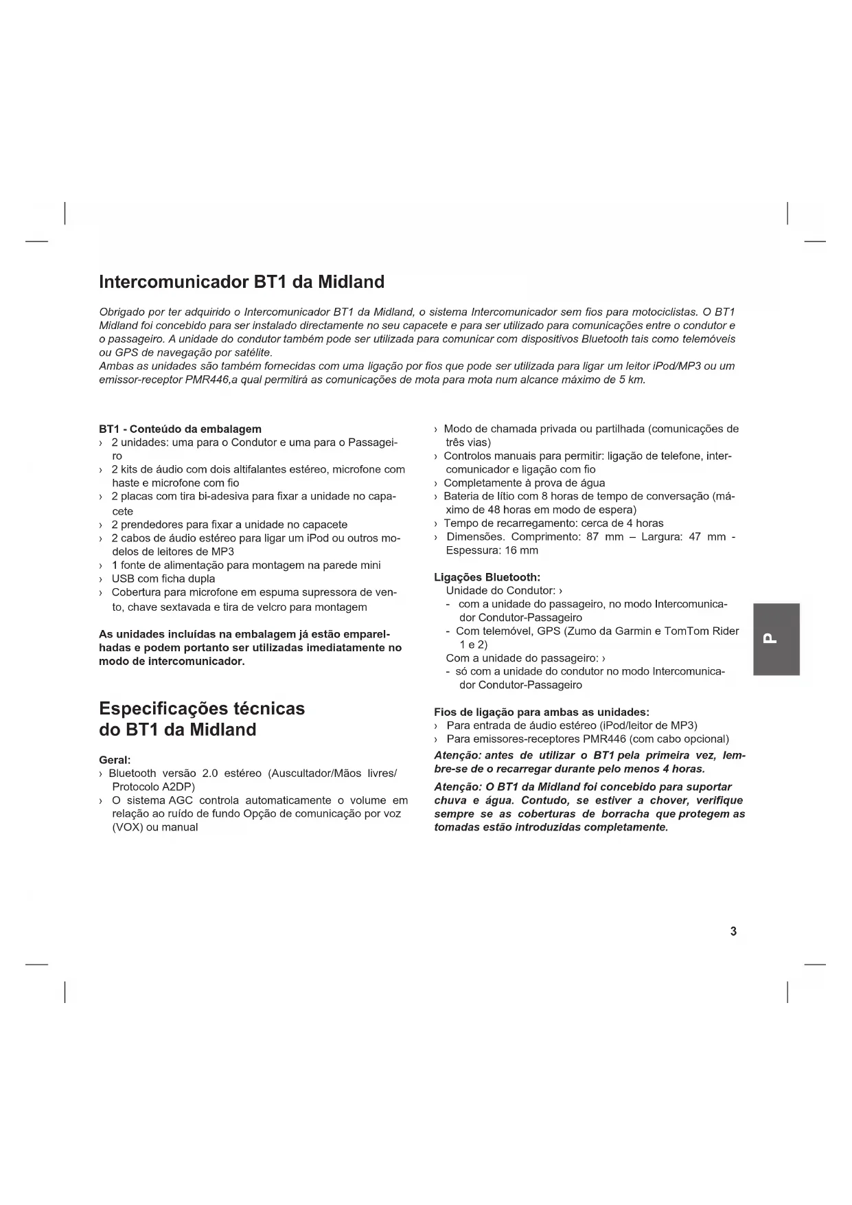 Intercomunicador BT1 da Midland Obrigado por ter adquirido o Intercomunicador BT1 da Midland, o sistema Intercomunicador sem os para motociclistas. O BT1 Midland foi concebido para ser instalado directamente no seu capacete e para ser utilizado para comunicações entre o condutor e o passageiro. A unidade do condutor também pode ser utilizada para comunicar com dispositivos Bluetooth tais como telemóveis ou GPS de navegação por satélite. Ambas as unidades são também fornecidas com uma ligação por os que pode ser utilizada para ligar um leitor iPod/MP3 ou um emissor-receptor PMR446,a qual permitirá as comunicações de mota para mota num alcance máximo de 5 km. BT1 - Conteúdo da embalagem › 2 unidades: uma para o Condutor e uma para o Passagei-