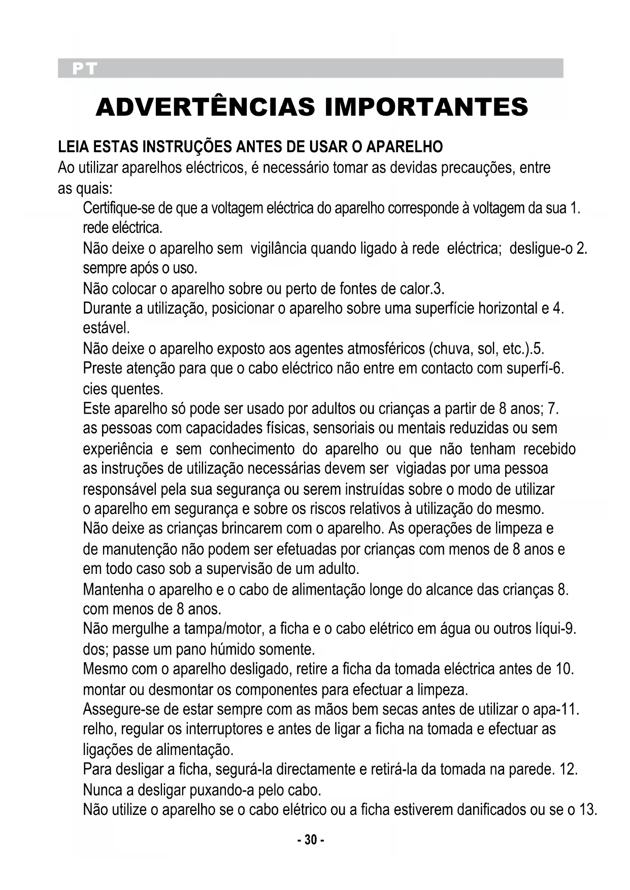 LEIA ESTAS INSTRUÇÕES ANTES DE USAR O APARELHO Ao utilizar aparelhos eléctricos, é necessário tomar as devidas precauções, entre as quais: Certifique-se de que a voltagem eléctrica do aparelho corresponde à voltagem da sua 1. rede eléctrica. Não deixe o aparelho sem vigilância quando ligado à rede eléctrica; desligue-o 2. sempre após o uso. Não colocar o aparelho sobre ou perto de fontes de calor.3. Durante a utilização, posicionar o aparelho sobre uma superfície horizontal e 4. estável. Não deixe o aparelho exposto aos agentes atmosféricos (chuva, sol, etc.).5. Preste atenção para que o cabo eléctrico não entre em contacto com superfí-6. cies quentes. Este aparelho só pode ser usado por adultos ou crianças a partir de 8 anos; 7. as pessoas com capacidades físicas, sensoriais ou mentais reduzidas ou sem experiência e sem conhecimento do aparelho ou que não tenham recebido as instruções de utilização necessárias devem ser vigiadas por uma pessoa responsável pela sua segurança ou serem instruídas sobre o modo de utilizar o aparelho em segurança e sobre os riscos relativos à utilização do mesmo. Não deixe as crianças brincarem com o aparelho. As operações de limpeza e de manutenção não podem ser efetuadas por crianças com menos de 8 anos e em todo caso sob a supervisão de um adulto. Mantenha o aparelho e o cabo de alimentação longe do alcance das crianças 8. com menos de 8 anos. Não mergulhe a tampa/motor, a ficha e o cabo elétrico em água ou outros líqui-9. dos; passe um pano húmido somente. Mesmo com o aparelho desligado, retire a ficha da tomada eléctrica antes de 10. montar ou desmontar os componentes para efectuar a limpeza. Assegure-se de estar sempre com as mãos bem secas antes de utilizar o apa-11. relho, regular os interruptores e antes de ligar a ficha na tomada e efectuar as ligações de alimentação. Para desligar a ficha, segurá-la directamente e retirá-la da tomada na parede. 12. Nunca a desligar puxando-a pelo cabo. Não utilize o aparelho se o cabo elétrico ou a ficha estiverem danificados ou se o 13.PT