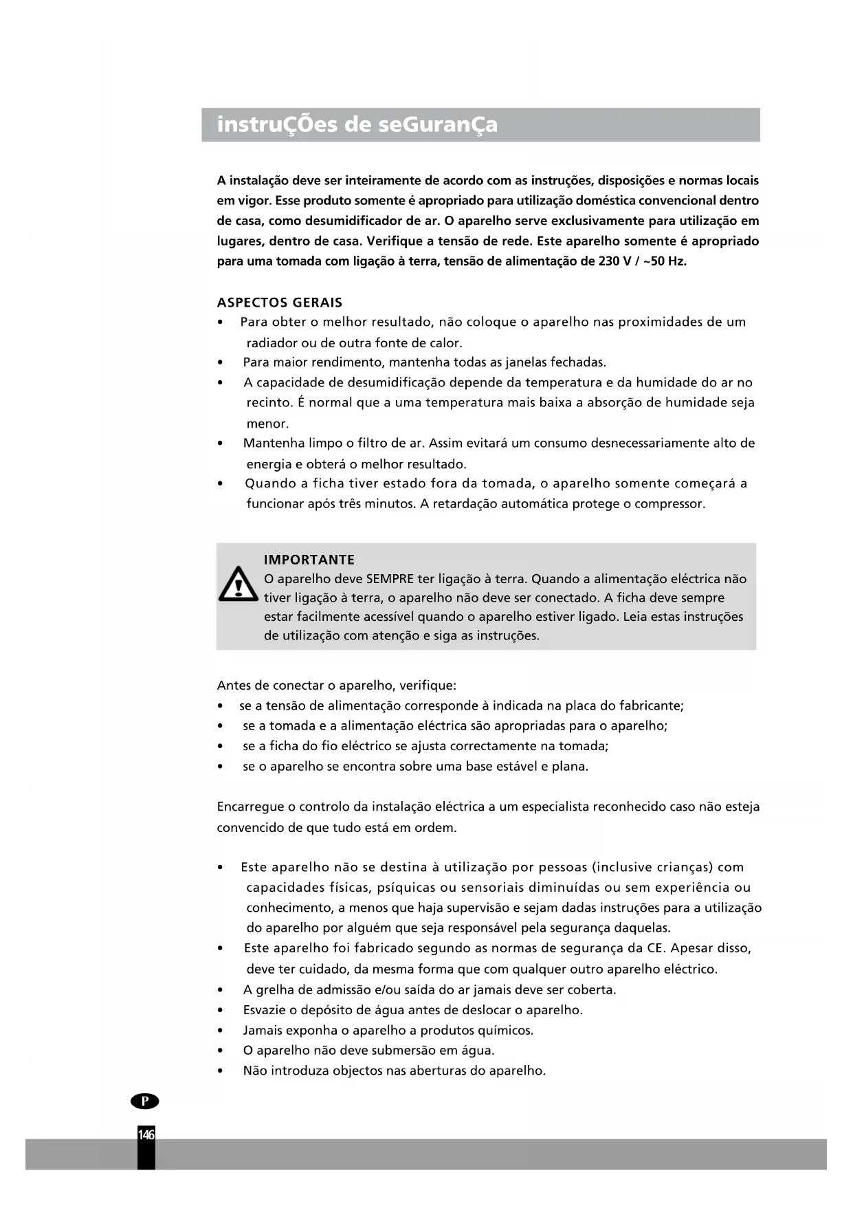 instruÇÕes de seGuranÇa A instalação deve ser inteiramente de acordo com as instruções, disposições e normas locais em vigor. Esse produto somente é apropriado para utilização doméstica convencional dentro de casa, como desumidificador de ar. O aparelho serve exclusivamente para utilização em lugares, dentro de casa. Verifique a tensão de rede. Este aparelho somente é apropriado para uma tomada com ligação à terra, tensão de alimentação de 230 V / ~50 Hz. ASPECTOS GERAIS