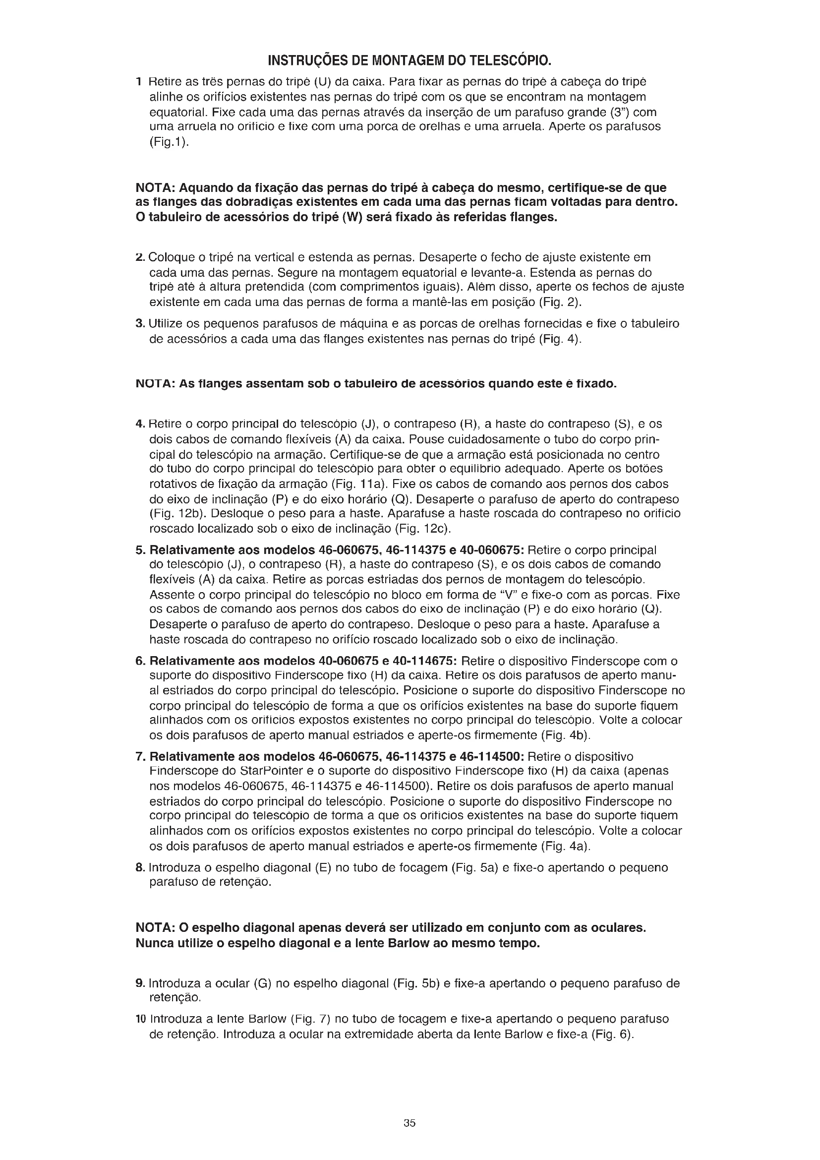Introduza a lente Barlow (Fig. 7) no tubo de focagem e fixe-a apertando o pequeno parafuso de retenção. Introduza a ocular na extremidade aberta da lente Barlow e fixe-a (Fig. 6). 35NOTA: Em todos os telescópios astronómicos a imagem aparece invertida. Com a utiliza- ção do espelho diagonal nos modelos refractores, a imagem aparece direita mas com uma inversão da esquerda para a direita (como num espelho). Para utilizar o telescópio para observações terrestres e para corrigir a imagem espelhada, retire o espelho diagonal e substitua-o pela ocular erectora de imagem. É aconselhável utilizar uma ocular de baixo aumento sempre que o telescópio é utilizado para efectuar observações terrestres. Os telescópios refractores podem ser utilizados para efectuar observações terrestres através da utilização de uma ocular erectora da imagem. Os telescópios reflectores são utilizados sobretudo para efectuar observações astronómicas. O telescópio está agora totalmente montado e pronto a ser utilizado. CUIDADO! A observação do sol pode provocar lesões oculares permanentes. Não observe o sol com este telescópio nem a olho nu.