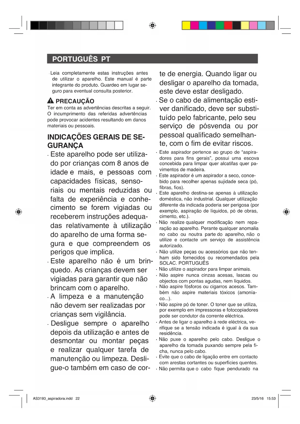 - Não permita que o cabo que pendurado na AS3193_aspiradora.indd 22 23/5/16 15:53PT borda da mesa, ou no tampo, de forma a evitar que as crianças puxem pelo mesmo e façam cair o aparelho.