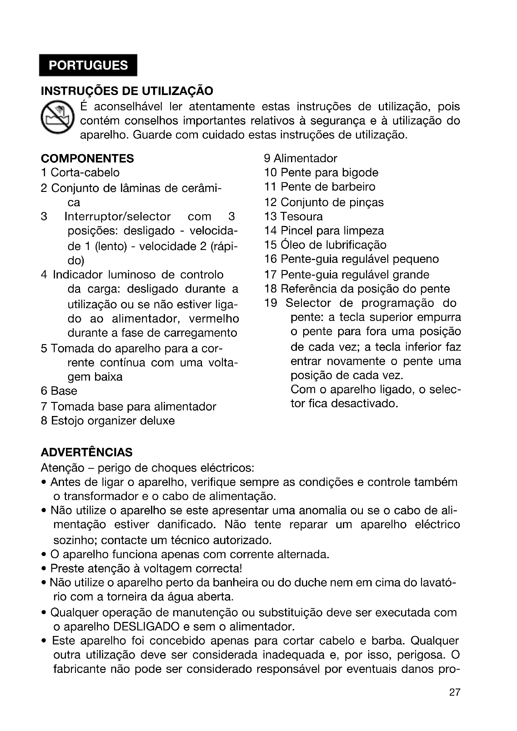 3 Interruptor/selector com 3 posições: desligado - velocida- de 1 (lento) - velocidade 2 (rápi- do) 4 Indicador luminoso de controlo da carga: desligado durante a utilização ou se não estiver liga- do ao alimentador, vermelho durante a fase de carregamento 5 Tomada do aparelho para a cor- rente contínua com uma volta- gem baixa 6 Base 7 Tomada base para alimentador 8 Estojo organizer deluxe 9 Alimentador 10 Pente para bigode 11 Pente de barbeiro 12 Conjunto de pinças 13 Tesoura 14 Pincel para limpeza 15 Óleo de lubrificação 16 Pente-guia regulável pequeno 17 Pente-guia regulável grande 18 Referência da posição do pente 19 Selector de programação do pente: a tecla superior empurra o pente para fora uma posição de cada vez; a tecla inferior faz entrar novamente o pente uma posição de cada vez. Com o aparelho ligado, o selec- tor fica desactivado. PORTUGUES 00060452 INTERNO 7-11-2005 14:43 Pagina 2728 vocados pela utilização inadequada ou errada do aparelho.