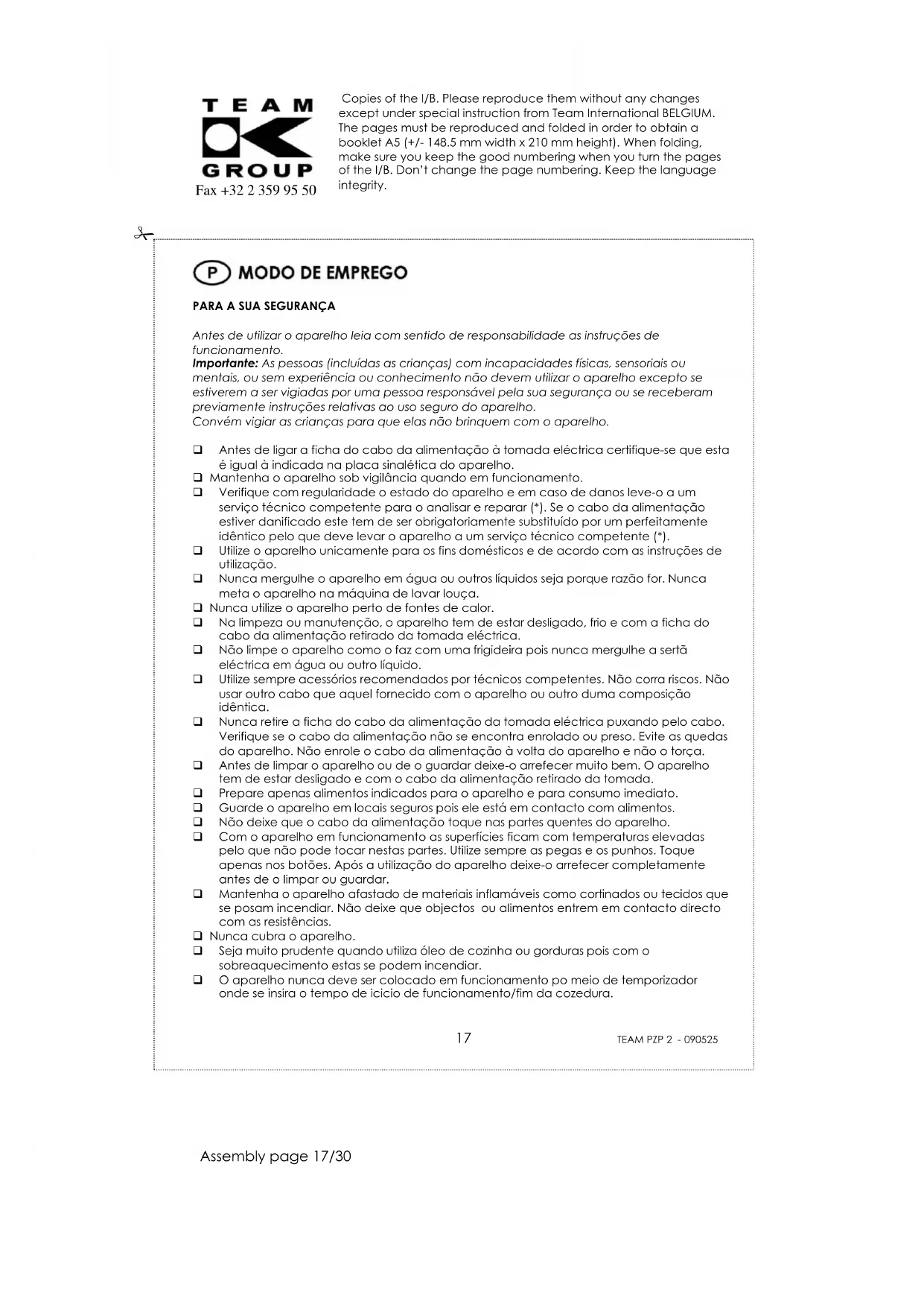 LIMPEZA Antes de limpar o aparelho, trode o botão do termóstato para a posição de desligado « MIN » e retire a ficha do cabo da alimentação da tomada eléctrica. Deixe arrefecer a sertã eléctrica antes de a limpar. Nunca mergulhe a sertã eléctrica na água ou em qualquer outro líquido e muito especialmente as conexões eléctricas. Caso entre humidade nas conexões eléctricas, deixe-as secar muito bem antes de voltar a utilizar a sertã eléctrica. Limpe as partes exteriores da sertã eléctrica com um pano ligeiramente húmido e não abrasivo. Seque muito bem o aparelho. Não use detergentes agressivos e produtos abrasivos. PROTECÇÃO DO MEIO AMBIENTE – DIRECTIVA 2002/96/CE Para a preservação do ambiente e da nossa saúde, a eliminação no fim da vida útil dos aparelhos eléctricos e electrónicos, deve-se efectuar no cumprimento das legislações em vigor e pela participação de todos quer sejam produtores ou utilizadores. É por esta razão que o vosso aparelho tem na placa sinalética o símbolo , informando que em caso algum o aparelho deve ser colocado no caixote do lixo camarário ou privado para que não vá para as lixeiras comuns mas sim devolvido ao revendedor ou depositado nos locais apropriados e identificados para a recolha destes aparelhos para que uma vez recolhidos sejam reciclados, reutilizados ou lhe sejam dados outras aplicações.Copies of the I/B. Please reproduce them without any changes except under special instruction from Team International BELGIUM. The pages must be reproduced and folded in order to obtain a booklet A5 (+/- 148.5 mm width x 210 mm height). When folding, make sure you keep the good numbering when you turn the pages of the I/B. Don’t change the page numbering. Keep the language integrity.