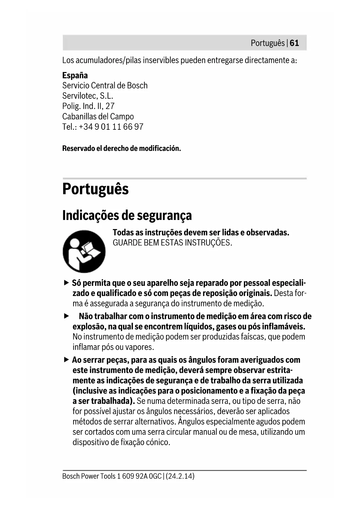 OBJ_BUCH-2116-002.book Page 67 Monday, February 24, 2014 10:56 AM68 | Português 1 609 92A 0GC | (24.2.14) Bosch Power Tools Pressione a tecla “MTR” 8. Enquanto mantiver pressionada a tecla “MTR” 8, é apresentado o ângulo de meia-esquadria horizontal calculado “MTR” que deve ser ajustado na serra de meia-esquadria. Ao mesmo tempo, o in- dicador “MTR” acende-se no display. Nota: O ângulo de meia-esquadria horizontal “MTR” calculado, só pode ser aceito para serras de corte e de meia-esquadria nas quais o ajuste para cortes verticais é 0°. Se o ajuste para cortes verticais for de 90°, será ne- cessário calcular o ângulo para a serra da seguinte maneira: 90° – ângulo indicado “MTR” = ângulo a ser ajustado na serra. Medição “Meia-esquadria dupla” A medição “Meia-esquadria dupla” (“Compound MTR”) serve para calcu- lar ângulos de meia-esquadria horizontais e verticais quando duas peças com múltiplos ângulos (p. ex. tramelas de tecto) devem encostar exacta- mente uma na outra. Em primeiro lugar, meça o ângulo de inclinação (SPR) e o ângulo do canto (CNR). O instrumento de medição calcula então o ângulo de meia-esqua- dria horizontal (MTR) e o ângulo de meia-esquadria vertical (BVL). Executar os passos de trabalho exactamente na sequência indicada. MTRMTR SPR CNR OBJ_BUCH-2116-002.book Page 68 Monday, February 24, 2014 10:56 AMPortuguês | 69 Bosch Power Tools 1 609 92A 0GC | (24.2.14) “1. SPR”: guardar o ângulo de inclinação (Spring Angle) Existem duas opções para guardar o ângulo de inclinação: – Abra a régua dobrável e a régua de base o suficiente para que o ângulo de inclinação desejado apareça no display. – Se o ângulo de inclinação for desconhecido, meça-o. Para tal, coloque a peça a medir entre a régua dobrável e a régua de base. Se não for possível a medição com o instrumento no caso de peças es- pecialmente pequenas, utilize meios auxiliares, como p. ex. um esqua- dro, e ajuste depois o ângulo no instrumento de medição. Pressione a tecla 7 para guardar o ângulo de inclinação medido para a meia-esquadria dupla. No display aparece “SPR” e o ângulo actual. “2° CNR”: memorizar o ângulo de canto (Corner Angle) SPR SPR CNRCNR OBJ_BUCH-2116-002.book Page 69 Monday, February 24, 2014 10:56 AM70 | Português 1 609 92A 0GC | (24.2.14) Bosch Power Tools Para medir o ângulo do canto, encoste a régua dobrável e a régua de base às paredes ou, se já souber qual é o ângulo do canto, ajuste-o no instru- mento de medição. Pressione novamente a tecla 7 para guardar o ângulo do canto medido pa- ra a meia-esquadria dupla. No display aparece “CNR” e o ângulo actual. “3. MTR”: determinar o ângulo de meia-esquadria horizontal (Miter Angle) Pressionar novamente a tecla 7. No display aparece “MTR” e o ângulo de meia-esquadria horizontal calculado para a serra de corte e de meia-es- quadria. A rotação da mesa de serrar é determinada com a ajuda de um ângulo de meia-esquadria horizontal (MTR). “4. BVL”: determinar o ângulo de meia-esquadria vertical (Bevel Angle) Pressionar novamente a tecla 7. No display aparece “BVL” e o ângulo de meia-esquadria vertical calculado para a serra de corte e de meia-esquadria. MTRMTR BVL BVL OBJ_BUCH-2116-002.book Page 70 Monday, February 24, 2014 10:56 AMPortuguês | 71 Bosch Power Tools 1 609 92A 0GC | (24.2.14) A inclinação da mesa de serrar é determinada com a ajuda de um ângulo de meia-esquadria vertical (BVL). Indicações para o tipo de funcionamento “meia-esquadria dupla” O ângulo de meia-esquadria horizontal “MTR” calculado, só pode ser acei- to para serras de corte e de meia-esquadria nas quais o ajuste para cortes verticais é 0°. Se o ajuste para cortes verticais for de 90°, será necessário calcular o ângulo para a serra da seguinte maneira: 90° – ângulo indicado “MTR” = ângulo a ser ajustado na serra. Manutenção e serviço Manutenção e limpeza Manter o instrumento de medição sempre limpo. Não mergulhar o instrumento de medição na água ou em outros líquidos. Limpar sujidades com um pano húmido e macio. Não utilizar produtos de limpeza nem solventes. Se o instrumento de medição for exposto durante muito tempo à chuva, poderão ocorrer problemas de funcionamento. O instrumento de medição está pronto para funcionar, assim que estiver completamente seco. Não é necessário calibrar. Serviço pós-venda e consultoria de aplicação O serviço pós-venda responde às suas perguntas a respeito de serviços de reparação e de manutenção do seu produto, assim como das peças so- bressalentes. Desenhos explodidos e informações sobre peças sobressa- lentes encontram-se em: www.bosch-pt.com A nossa equipa de consultoria de aplicação Bosch esclarecem com prazer todas as suas dúvidas a respeito da compra, aplicação e ajuste dos produ- tos e acessórios. Para todas as questões e encomendas de peças sobressalentas é impres- cindível indicar o número de produto de 10 dígitos como consta na placa de características do instrumento de medição. OBJ_BUCH-2116-002.book Page 71 Monday, February 24, 2014 10:56 AM72 | Português 1 609 92A 0GC | (24.2.14) Bosch Power Tools Portugal Robert Bosch LDA Avenida Infante D. Henrique Lotes 2E – 3E 1800 Lisboa Para efectuar o seu pedido online de peças entre na página www.ferra- mentasbosch.com. Tel.: 21 8500000 Fax: 21 8511096 Brasil Robert Bosch Ltda. Caixa postal 1195 13065-900 Campinas Tel.: (0800) 7045446 www.bosch.com.br/contacto Eliminação Instrumentos de medição, acessórios e embalagens devem ser enviados a uma reciclagem ecológica de matéria prima. Não deitar os instrumentos de medição e acumuladores/pilhas no lixo do- méstico! Apenas países da União Europeia: Conforme as Directivas Europeias 2012/19/UE relativa aos resíduos de instrumentos de medição europeias 2006/66/CE é necessário recolher separa