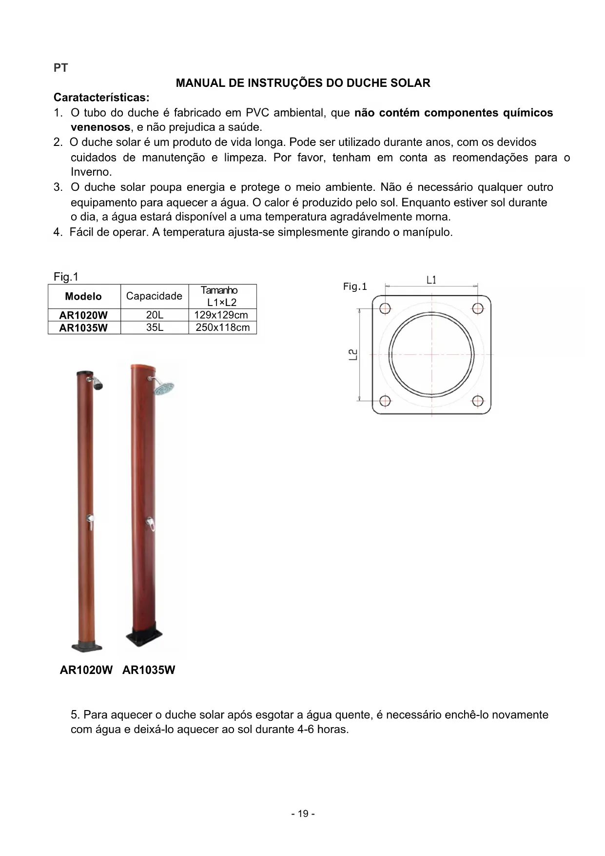 - O ducha solar é um produto de vida longa. Pode ser utilizado durante anos, com os devidoseguardados de manutenção e limpeza. Por favor, tenham em conta as reformações para o Inverno.