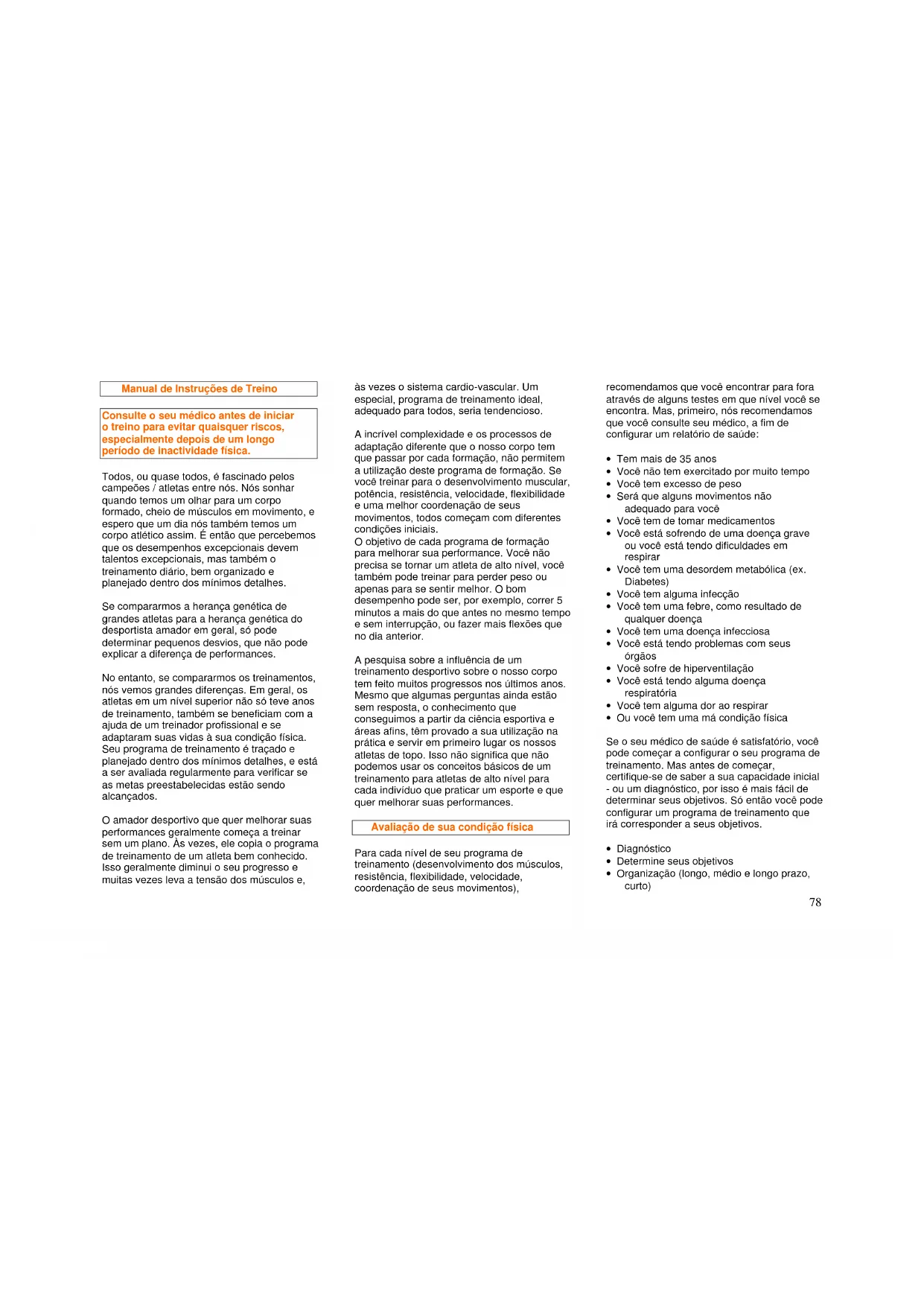 Consulte o seu médico antes de iniciar o treino para evitar quaisquer riscos, especialmente depois de um longo período de inactividade física.