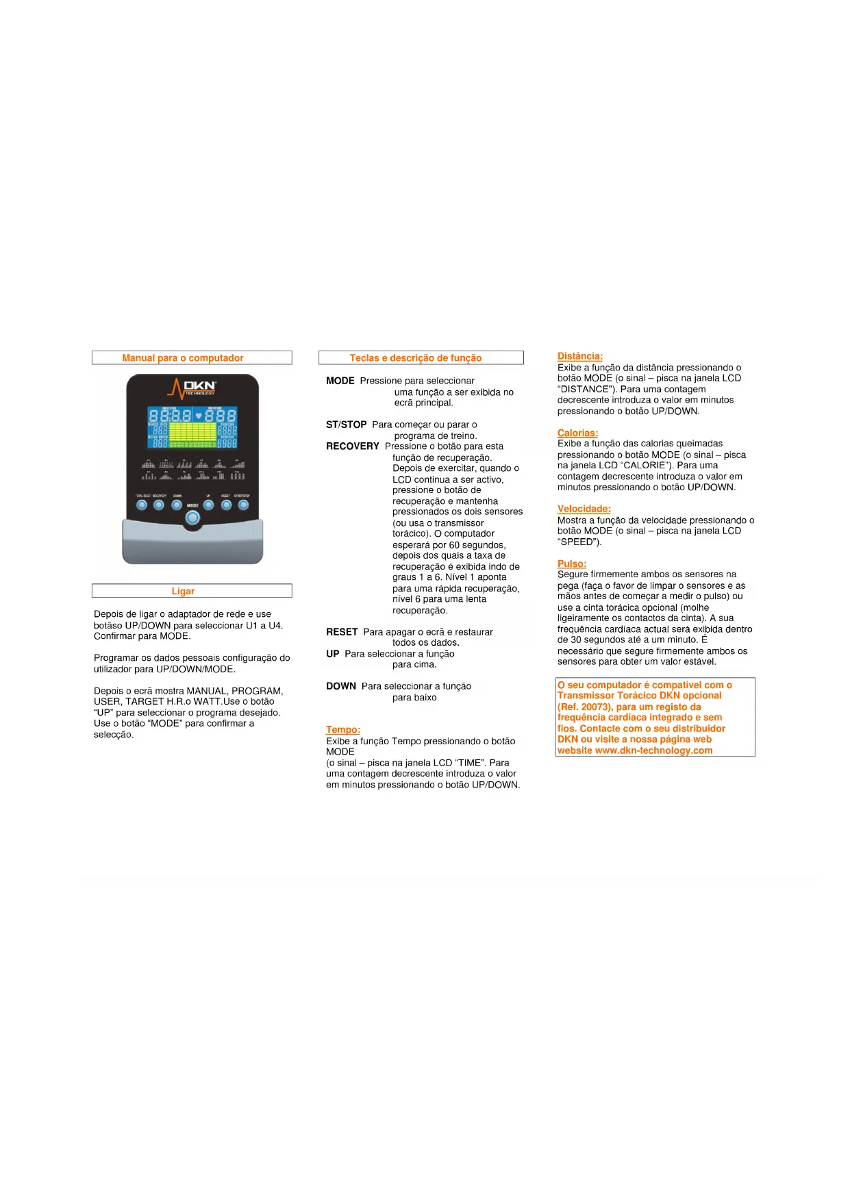 O seu computador é compativel com o Transmitter Torácico DKN optional (Ref. 20073), para um registro da frequência cardíaca integrado e sem flos. Contacte com o seu distribuidor DKN ou visite a)nossa págnay web website www.dkn-technology.com
