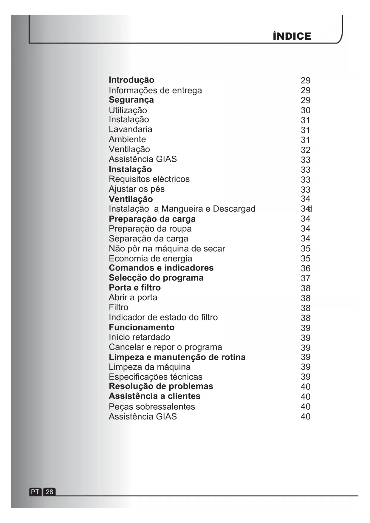 27Introdução Informações de entrega Segurança Utilização Instalação Lavandaria Ambiente Ventilação Assistência GIAS Instalação Requisitos eléctricos Ajustar os pés Ventilação Instalação a Mangueira e Descargad d Preparação da carga Preparação da roupa Separação da carga Não pôr na máquina de secar Economia de energia Comandos e indicadores Selecção do programa Porta e filtro Abrir a porta Filtro Indicador de estado do filtro Funcionamento Início retardado Cancelar e repor o programa Limpeza e manutenção de rotina Limpeza da máquina Especificações técnicas Resolução de problemas Assistência a clientes Peças sobressalentes Assistência GIAS ÍNDICE