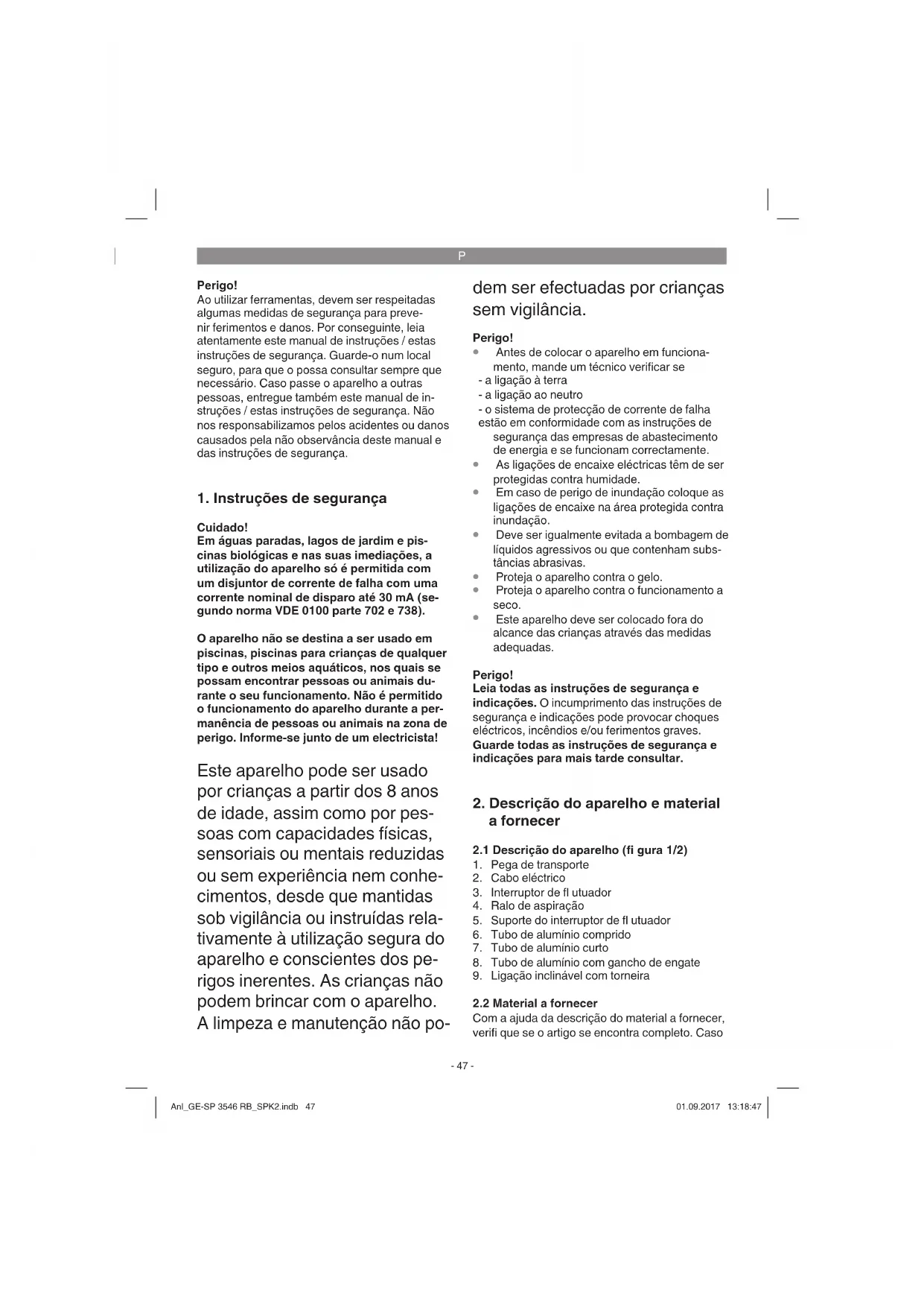Cuidado! Em águas paradas, lagos de jardim e pis- cinas biológicas e nas suas imediações, a utilização do aparelho só é permitida com um disjuntor de corrente de falha com uma corrente nominal de disparo até 30 mA (se- gundo norma VDE 0100 parte 702 e 738). O aparelho não se destina a ser usado em piscinas, piscinas para crianças de qualquer tipo e outros meios aquáticos, nos quais se possam encontrar pessoas ou animais du- rante o seu funcionamento. Não é permitido o funcionamento do aparelho durante a per- manência de pessoas ou animais na zona de perigo. Informe-se junto de um electricista! Este aparelho pode ser usado por crianças a partir dos 8 anos de idade, assim como por pes- soas com capacidades físicas, sensoriais ou mentais reduzidas ou sem experiência nem conhe- cimentos, desde que mantidas sob vigilância ou instruídas rela- tivamente à utilização segura do aparelho e conscientes dos pe- rigos inerentes. As crianças não podem brincar com o aparelho. A limpeza e manutenção não po- dem ser efectuadas por crianças sem vigilância. Perigo!