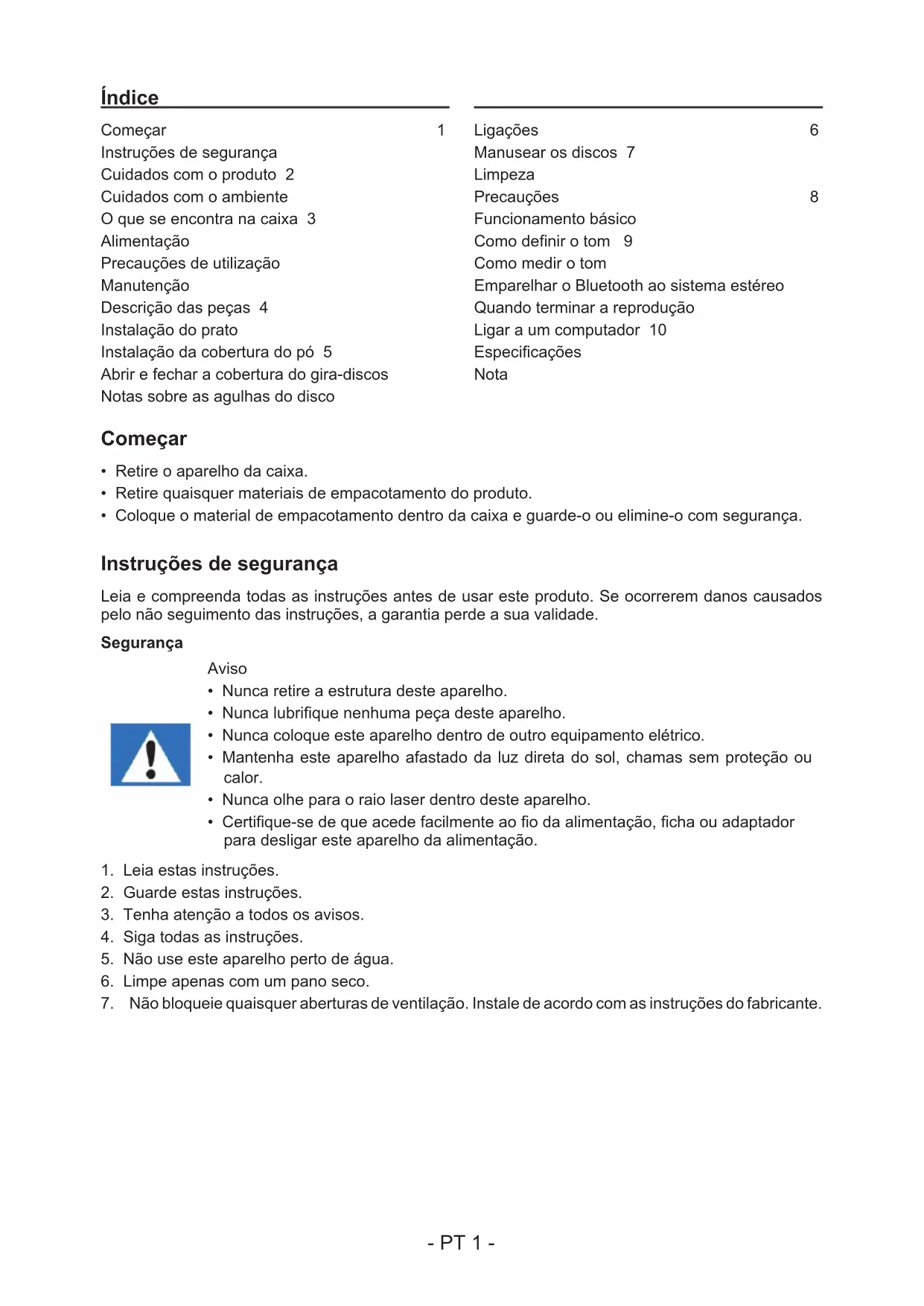 LEIA TODO O MANUAL DE UTILIZADOR ANTES DE TRABALHAR COM ESTA UNIDADE E GUARDE O FOLHETO PARA REFERÊNCIA FUTURA. PT- PT 1 - Índice Começar 1 Instruções de segurança Cuidados com o produto 2 Cuidados com o ambiente O que se encontra na caixa 3 Alimentação Precauções de utilização Manutenção Descrição das peças 4 Instalação do prato Instalação da cobertura do pó 5 Abrir e fechar a cobertura do gira-discos Notas sobre as agulhas do disco Ligações 6 Manusear os discos 7 Limpeza Precauções 8 Funcionamento básico Como denir o tom 9 Como medir o tom Emparelhar o Bluetooth ao sistema estéreo Quando terminar a reprodução Ligar a um computador 10 Especicações Nota Começar
