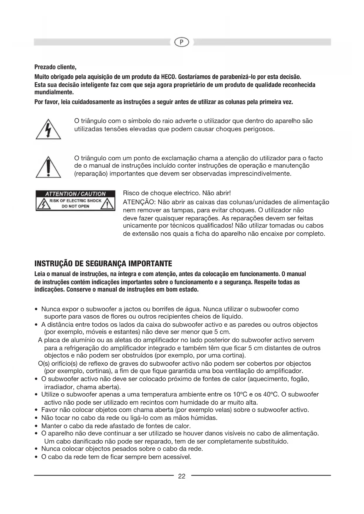 New Phalanx 302A New Phalanx 202A Conguración: Subwoofer activo Subwoofer activo Componentes: 30 cm woofer 30 cm radiador de bajos 20 cm woofer 20 cm radiador de bajos Potencia de salida RMS/Máx.: 250 / 400 vatios 220 / 350 vatios Gama de frecuencias: 18 – 150 Hz 20 – 150 Hz Frecuencia de separación: 50 – 150 Hz regulable 50 – 150 Hz regulable Dimensiones (an x al x pr): 380 x 442 x 435 mm 270 x 285 x 305 mm Accesorios: Cable de la red Cable de la red RESERVADOS LOS DERECHOS DE REALIZAR CAMBIOS TÉCNICOS.22 Prezado cliente, Muito obrigado pela aquisição de um produto da HECO. Gostaríamos de parabenizá-lo por esta decisão. Esta sua decisão inteligente faz com que seja agora proprietário de um produto de qualidade reconhecida mundialmente. Por favor, leia cuidadosamente as instruções a seguir antes de utilizar as colunas pela primeira vez. O triângulo com o símbolo do raio adverte o utilizador que dentro do aparelho são utilizadas tensões elevadas que podem causar choques perigosos. O triângulo com um ponto de exclamação chama a atenção do utilizador para o facto de o manual de instruções incluído conter instruções de operação e manutenção (reparação) importantes que devem ser observadas imprescindivelmente. Risco de choque electrico. Não abrir! ATENÇÃO: Não abrir as caixas das colunas/unidades de alimentação nem remover as tampas, para evitar choques. O utilizador não deve fazer quaisquer reparações. As reparações devem ser feitas unicamente por técnicos qualicados! Não utilizar tomadas ou cabos de extensão nos quais a cha do aparelho não encaixe por completo.