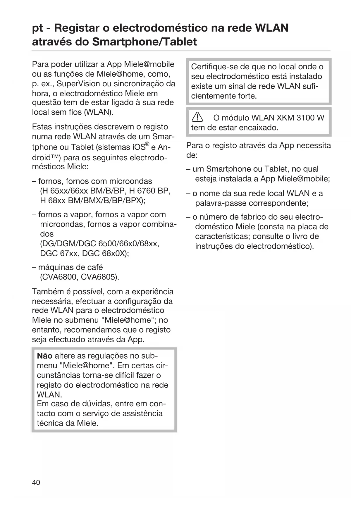 e An- droid™) para os seguintes electrodo- mésticos Miele: – fornos, fornos com microondas (H65xx/66xxBM/B/BP, H6760BP, H68xxBM/BMX/B/BP/BPX); – fornos a vapor, fornos a vapor com microondas, fornos a vapor combina- dos (DG/DGM/DGC6500/66x0/68xx, DGC67xx, DGC68x0X); – máquinas de café (CVA6800, CVA6805). Também é possível, com a experiência necessária, efectuar a configuração da rede WLAN para o electrodoméstico Miele no submenu "Miele@home"; no entanto, recomendamos que o registo seja efectuado através da App. Não altere as regulações no sub- menu "Miele@home". Em certas cir- cunstâncias torna-se difícil fazer o registo do electrodoméstico na rede WLAN. Em caso de dúvidas, entre em con- tacto com o serviço de assistência técnica da Miele. Certifique-se de que no local onde o seu electrodoméstico está instalado existe um sinal de rede WLAN sufi- cientemente forte. O módulo WLAN XKM 3100 W tem de estar encaixado. Para o registo através da App necessita de: – um Smartphone ou Tablet, no qual esteja instalada a App Miele@mobile; – o nome da sua rede local WLAN e a palavra-passe correspondente; – o número de fabrico do seu electro- doméstico Miele (consta na placa de características; consulte o livro de instruções do electrodoméstico).pt - Registar o electrodoméstico na rede WLAN através do Smartphone/Tablet