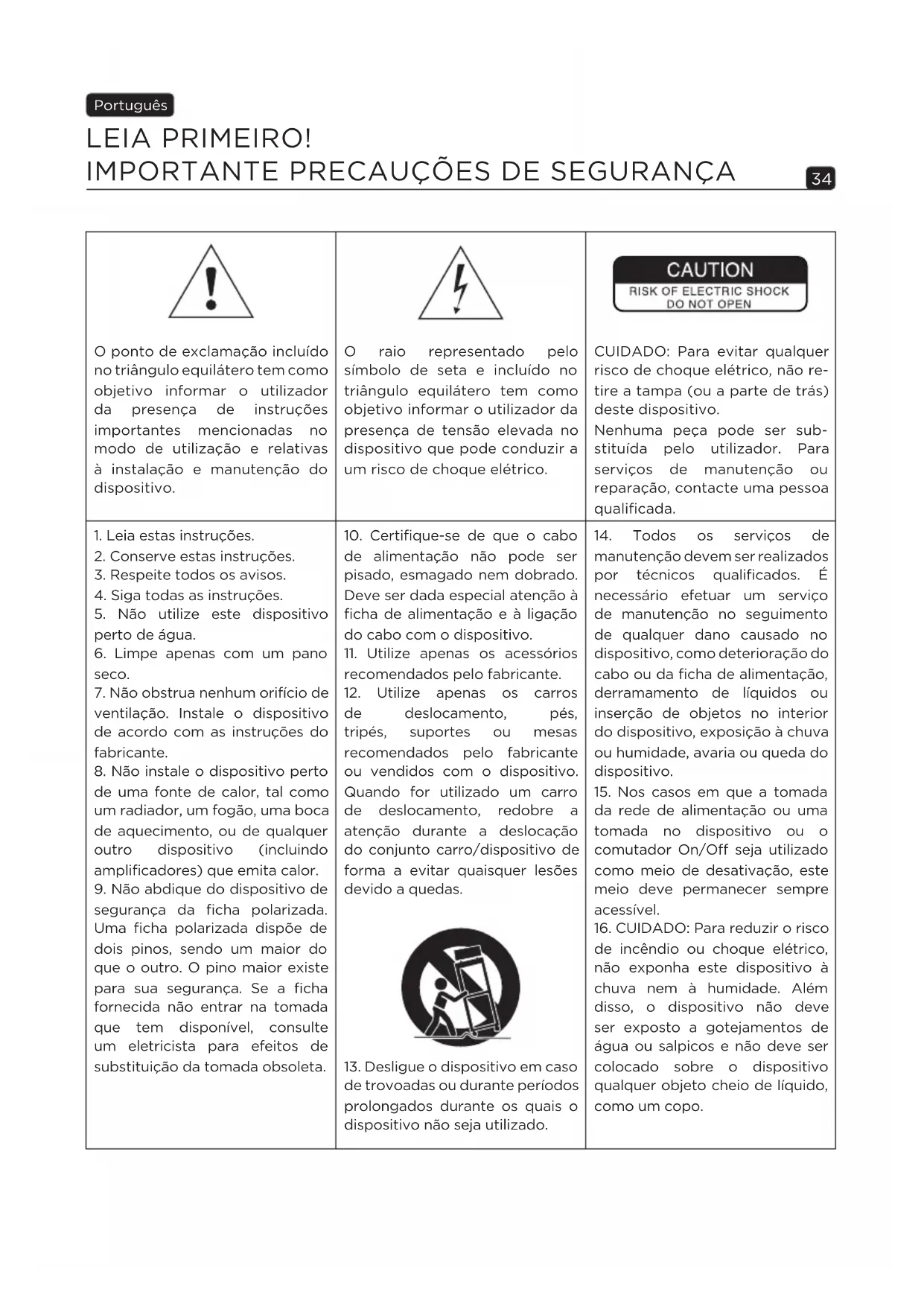 O ponto de exclamação incluído no triângulo equilátero tem como objetivo informar o utilizador da presença de instruções importantes mencionadas no modo de utilização e relativas à instalação e manutenção do dispositivo. O raio representado pelo símbolo de seta e incluído no triângulo equilátero tem como objetivo informar o utilizador da presença de tensão elevada no dispositivo que pode conduzir a um risco de choque elétrico. CUIDADO: Para evitar qualquer risco de choque elétrico, não re- tire a tampa (ou a parte de trás) deste dispositivo. Nenhuma peça pode ser sub- stituída pelo utilizador. Para serviços de manutenção ou reparação, contacte uma pessoa qualificada.