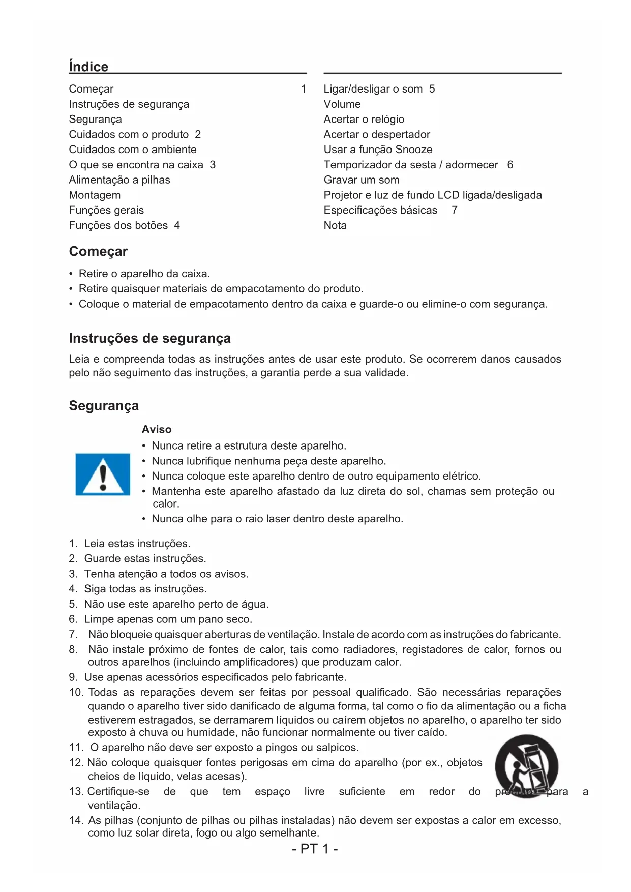 - Todas as reparações devem ser feitas por pessoal qualificado. São necessárias reparações quando o aparelho tiver sido danificado de alguma forma, tal como o fio da alimentação ou a ficha estiverem estragados, se derramarem líquidos ou caírem objetos no aparelho, o aparelho ter sido exposto à chuva ou humidade, não funcionar normalmente ou tiver caído.