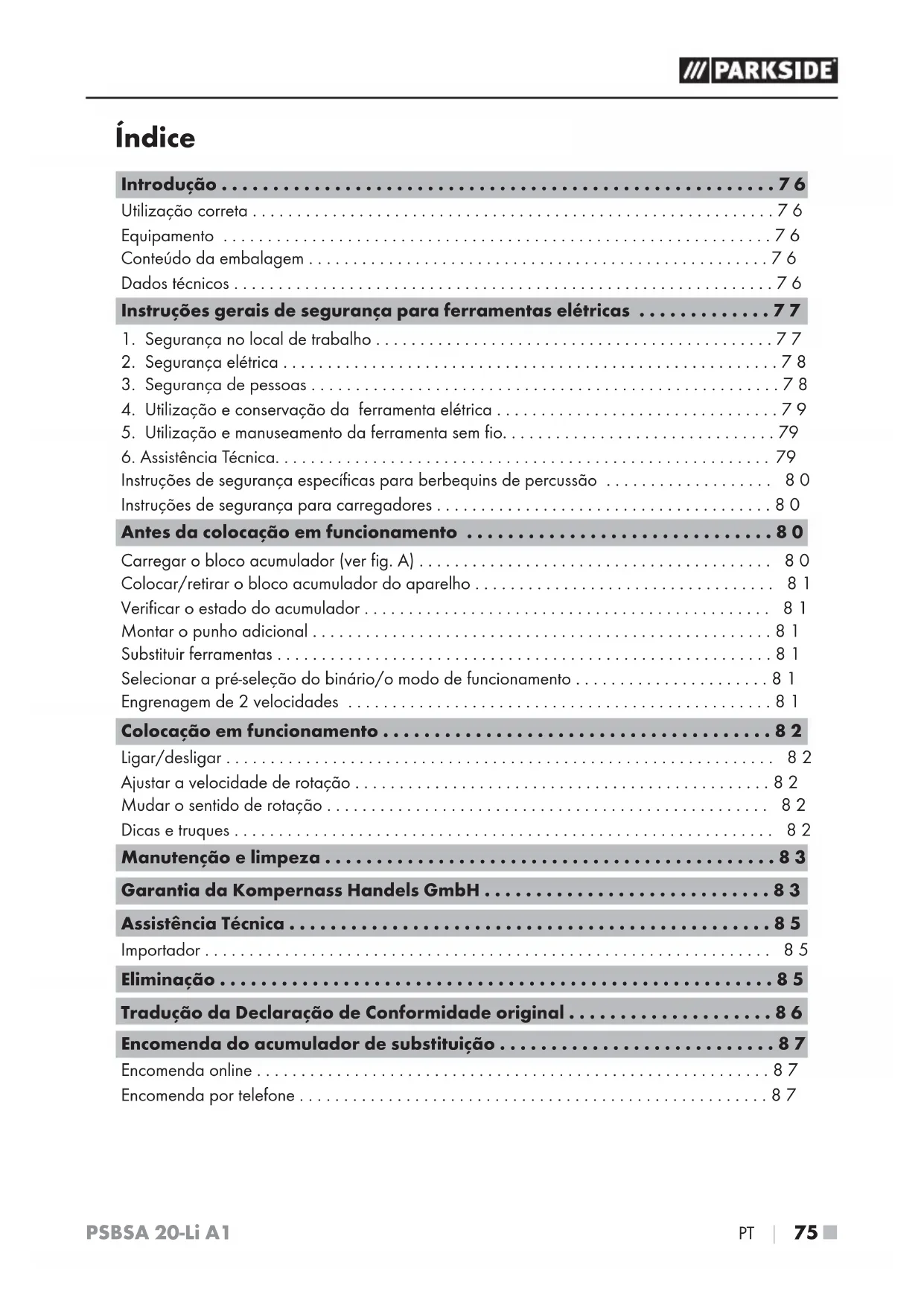 - Encomenda por telefone PSBSA 20-Li A1 ■ 76 │ PT p. 87