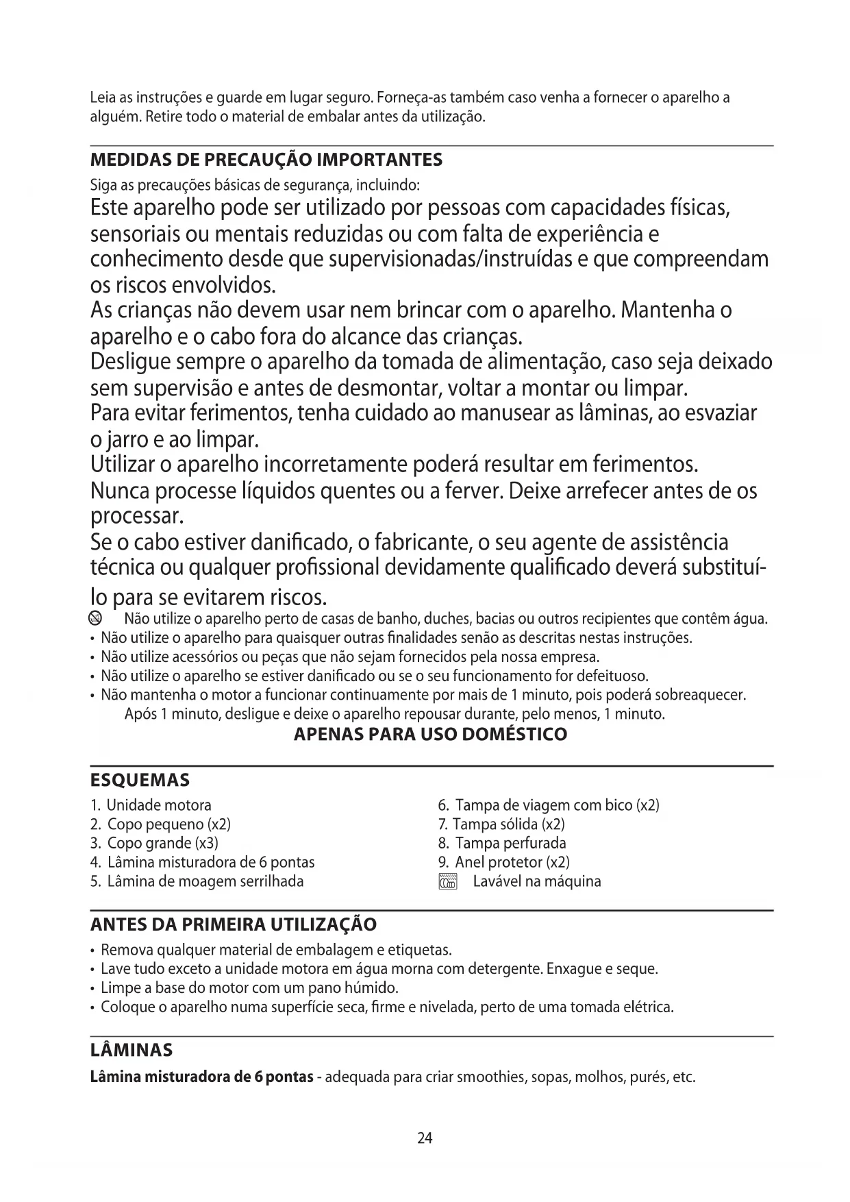 Siga as precauções básicas de segurança, incluindo: Este aparelho pode ser utilizado por pessoas com capacidades físicas, sensoriais ou mentais reduzidas ou com falta de experiência e conhecimento desde que supervisionadas/instruídas e que compreendam os riscos envolvidos. As crianças não devem usar nem brincar com o aparelho. Mantenha o aparelho e o cabo fora do alcance das crianças. Desligue sempre o aparelho da tomada de alimentação, caso seja deixado sem supervisão e antes de desmontar, voltar a montar ou limpar. Para evitar ferimentos, tenha cuidado ao manusear as lâminas, ao esvaziar o jarro e ao limpar. Utilizar o aparelho incorretamente poderá resultar em ferimentos. Nunca processe líquidos quentes ou a ferver. Deixe arrefecer antes de os processar. Se o cabo estiver danicado, o fabricante, o seu agente de assistência técnica ou qualquer prossional devidamente qualicado deverá substituí- lo para se evitarem riscos.